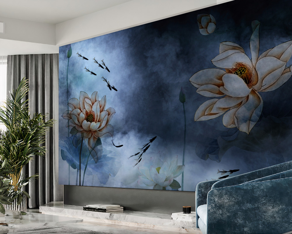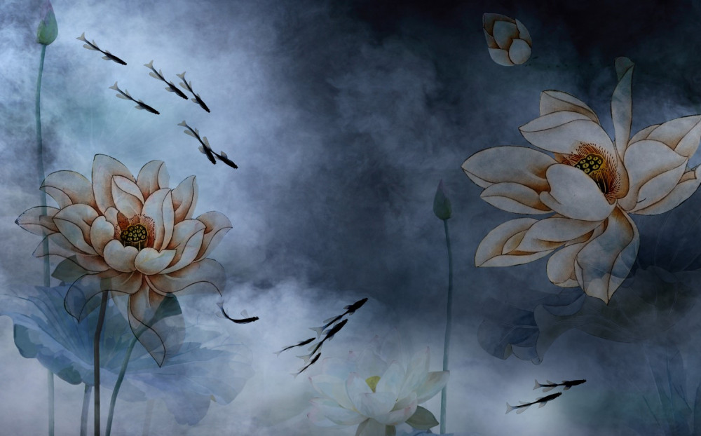 Tapeta Fototapeta ryby pływające w pobliżu kwiatów (artykuł a92258 ) z kategorii Fototapety 3D