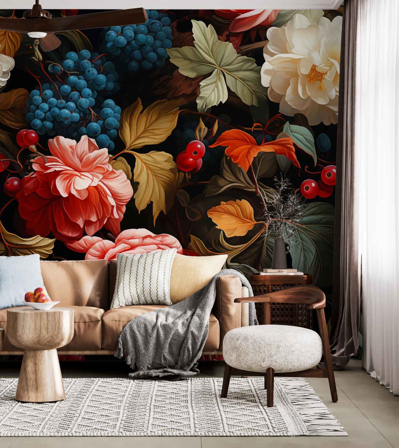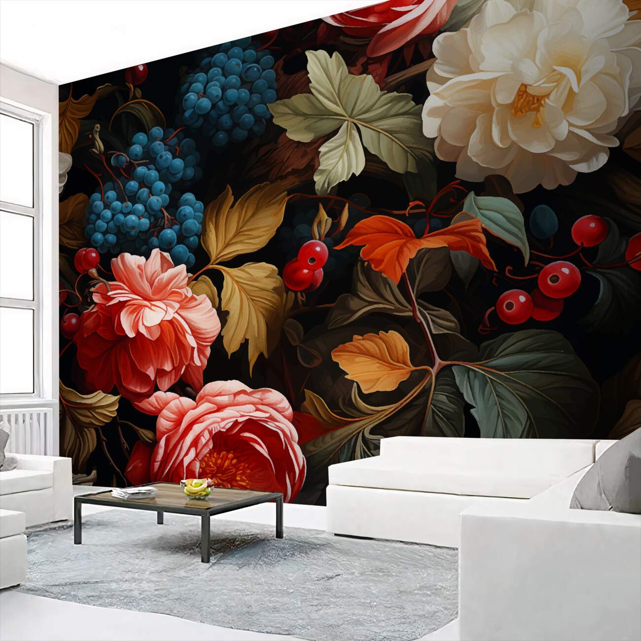 Tapeta Fototapeta Skład masowych świeżych kwiatów i jagód (artykuł a99987 ) z kategorii Fototapety 3D