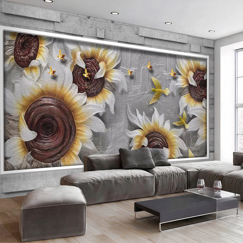 Tapeta Fototapeta słoneczniki i białe motyle (artykuł pb8901 ) z kategorii Fototapety 3D