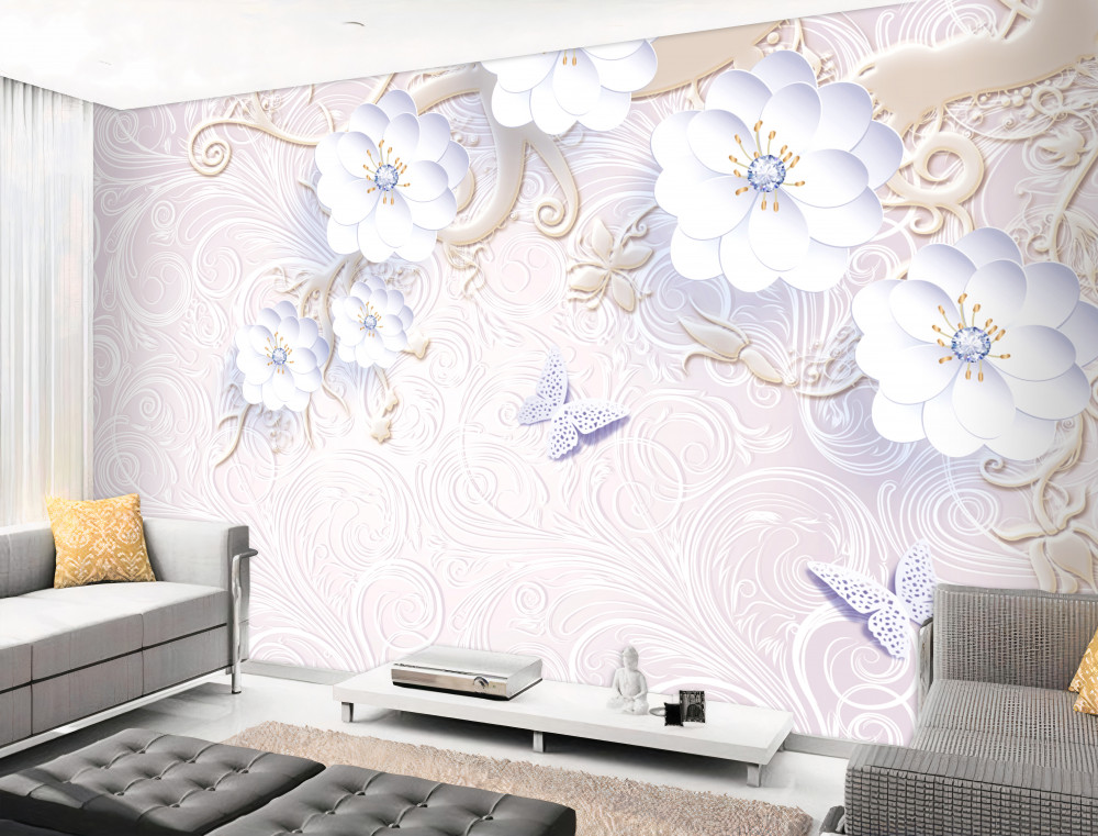Tapeta Fototapeta śnieżnobiały kwiat i latające motyle (artykuł a90361 ) z kategorii Fototapety 3D