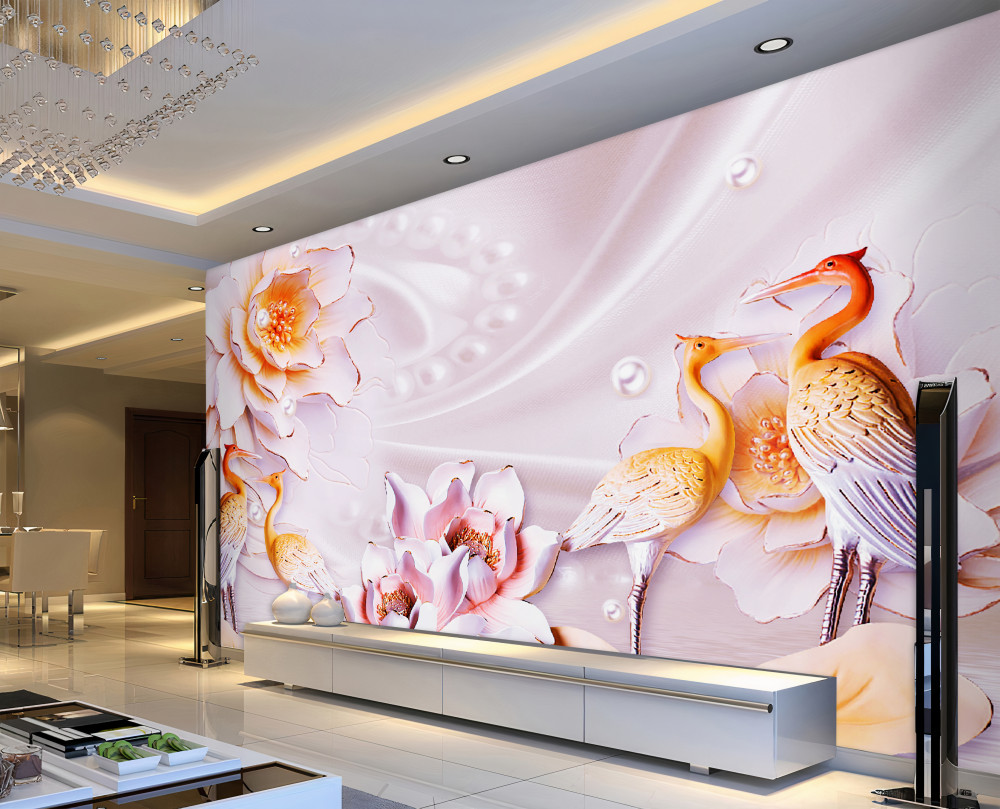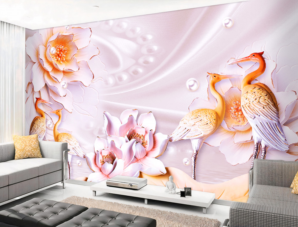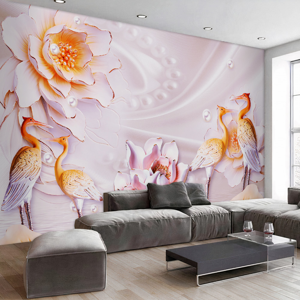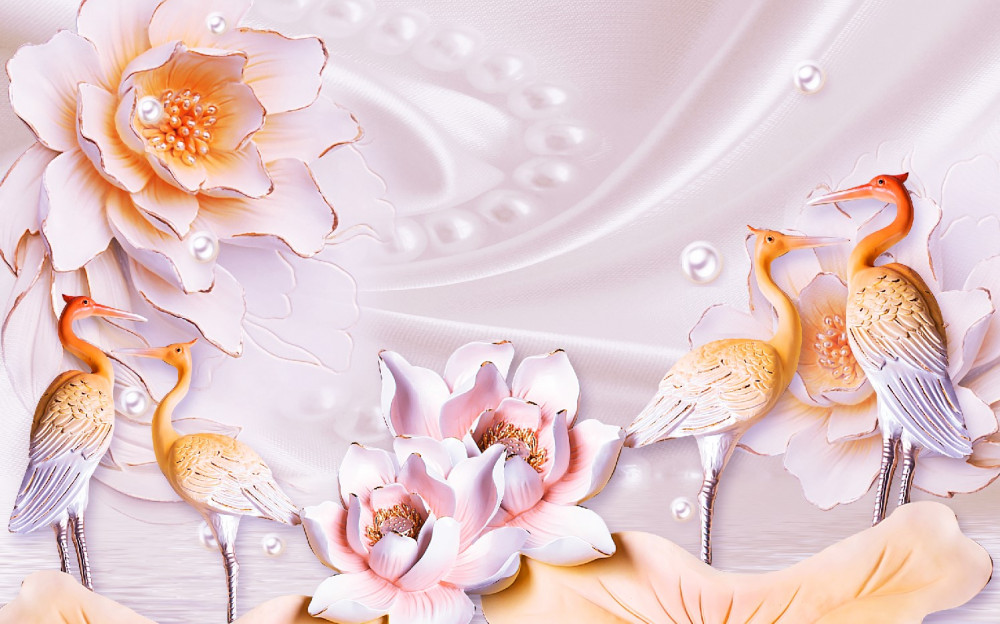 Tapeta Fototapeta stado ptaków i białe kwiaty na jedwabiu (artykuł pb8911 ) z kategorii Fototapety 3D
