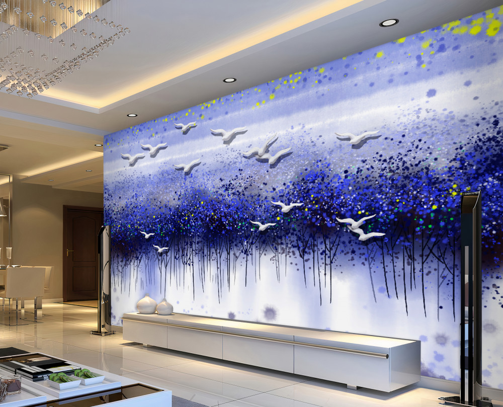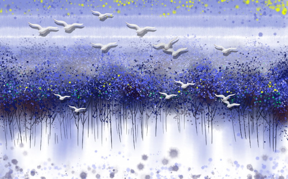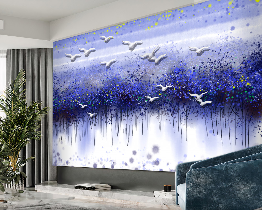 Tapeta Fototapeta stado ptaków nad lasem i jeziorem o zmierzchu (artykuł pb8932 ) z kategorii Fototapety 3D