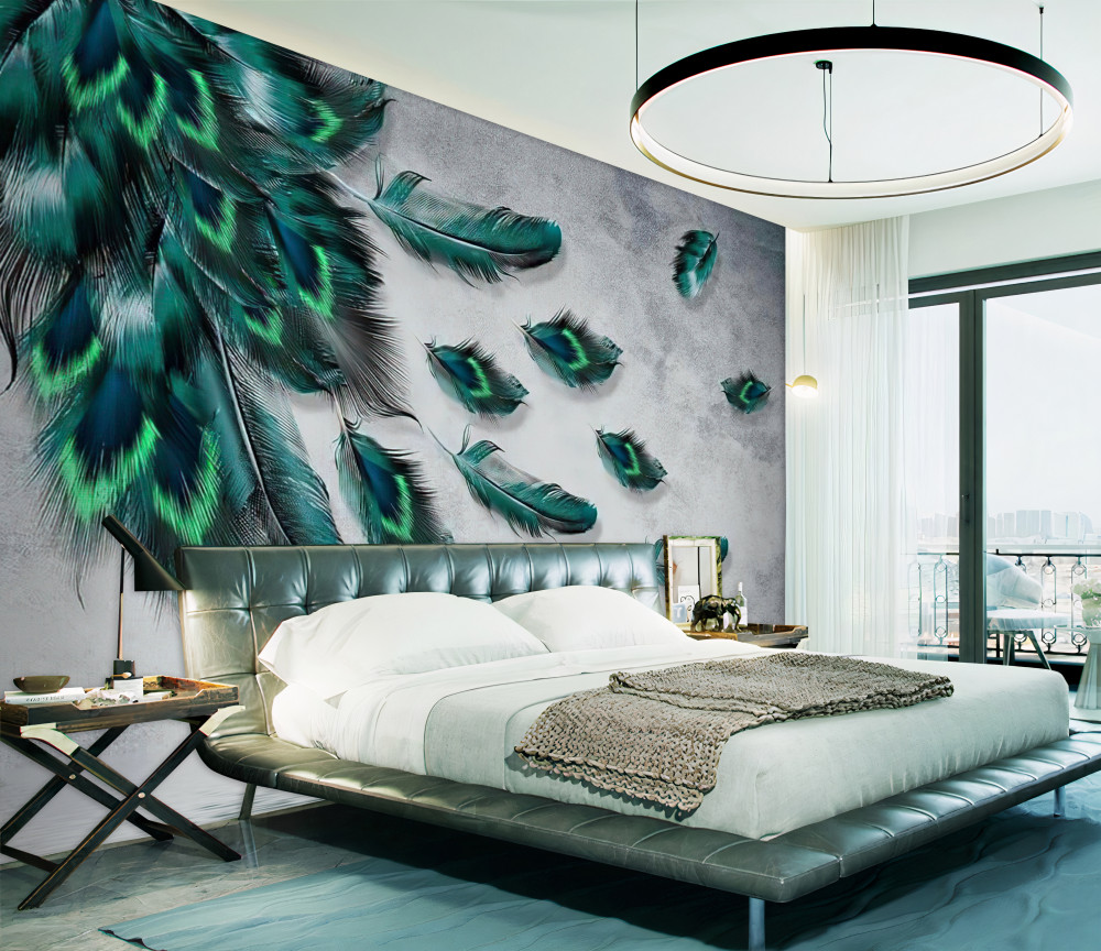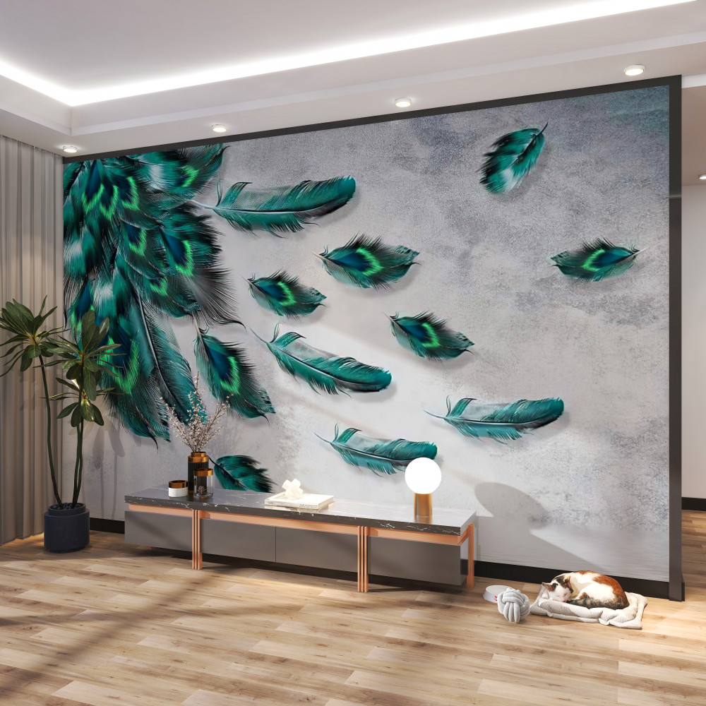 Tapeta Fototapeta szmaragdowe pawie pióra spadają na wodę (artykuł a93258 ) z kategorii Fototapety 3D