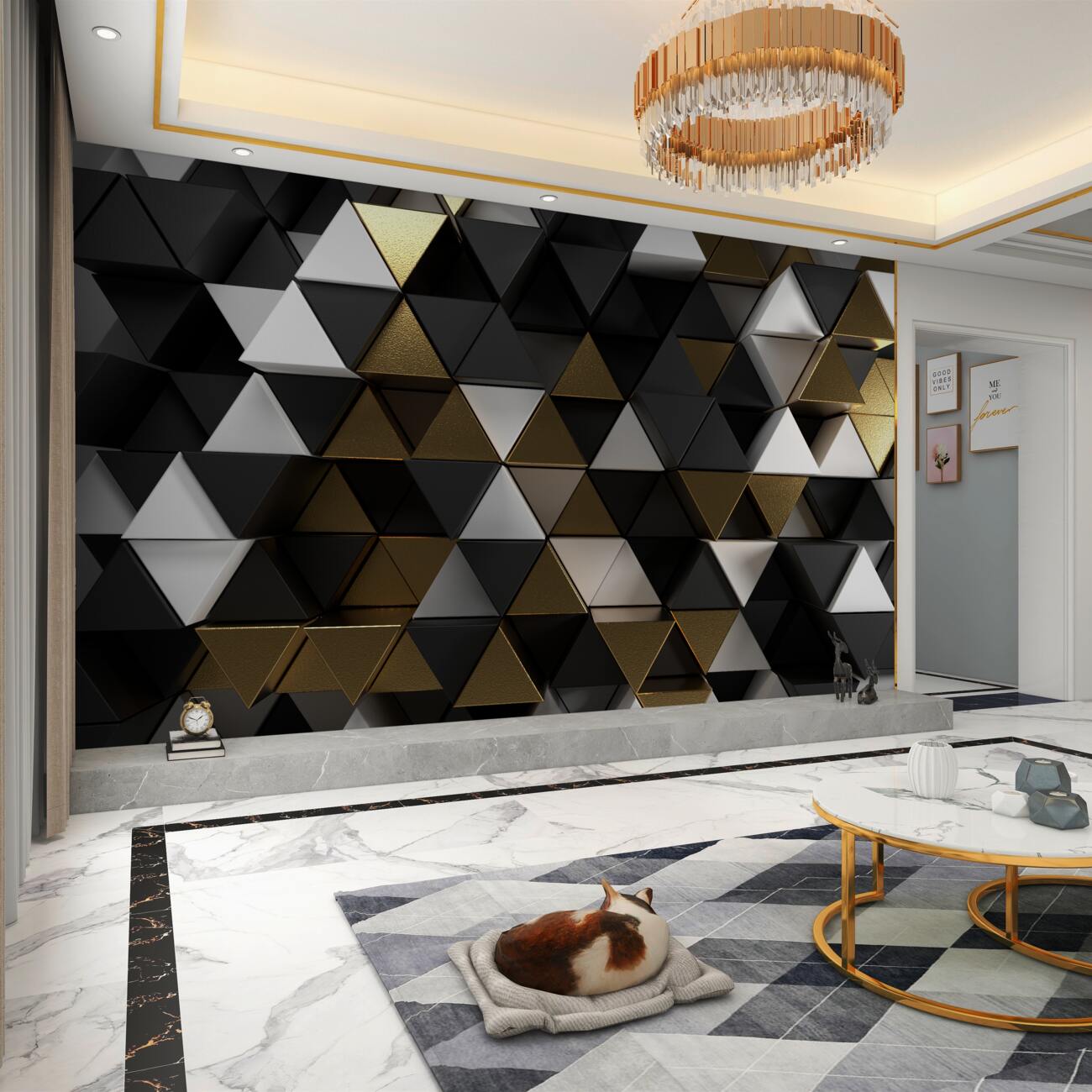 Tapeta Fototapeta Trójkąty wolumetryczne są czarne i złoto (artykuł a99665 ) z kategorii Fototapety 3D