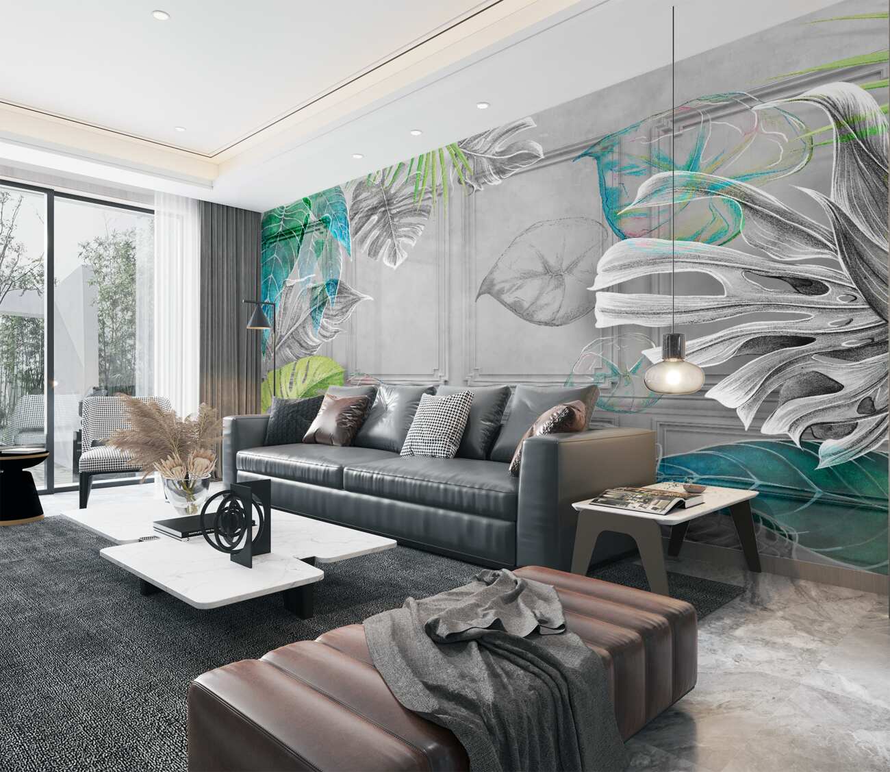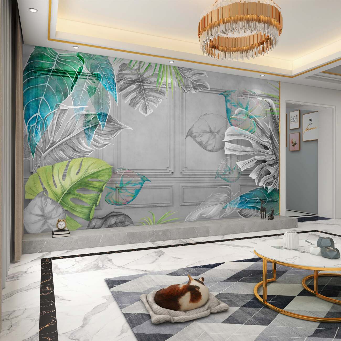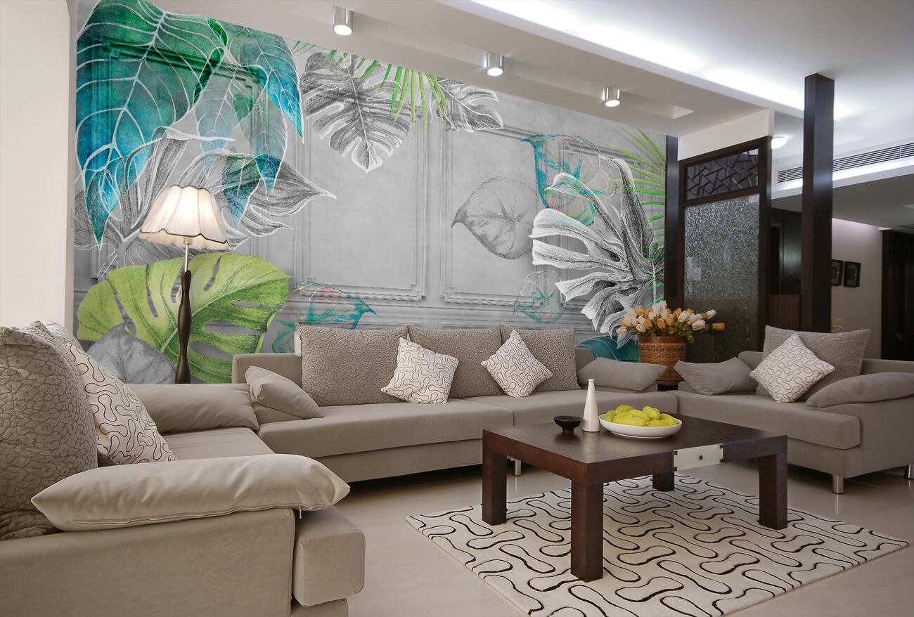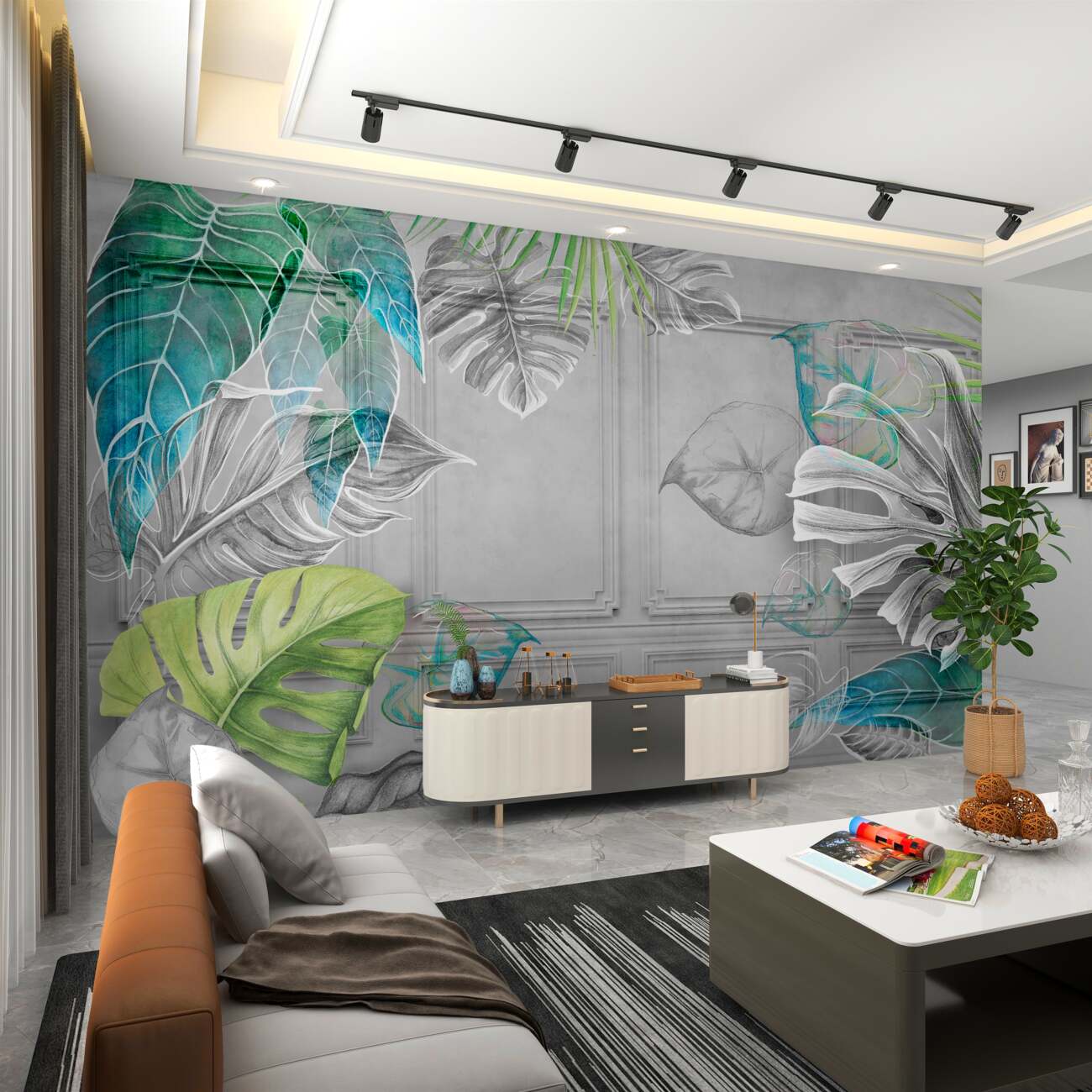 Tapeta Fototapeta Tropikalne liście na tle teksturowanej ściany (artykuł a99037 ) z kategorii Fototapety 3D