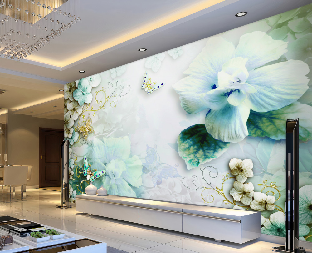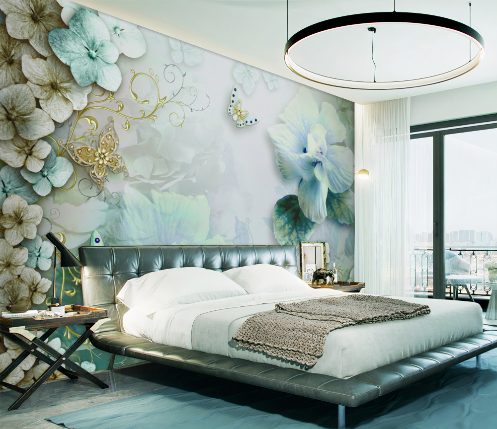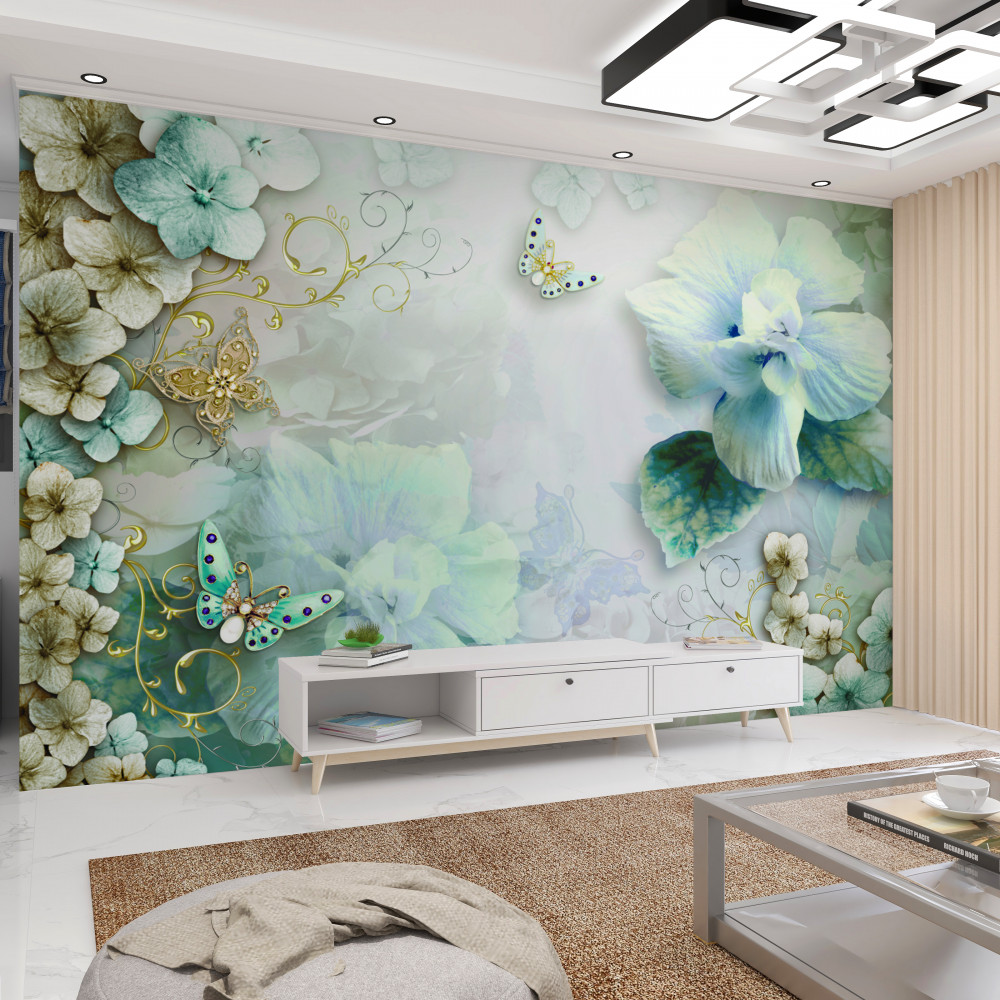 Tapeta Fototapeta turkusowe kwiaty i motyle (artykuł a90708 ) z kategorii Fototapety 3D
