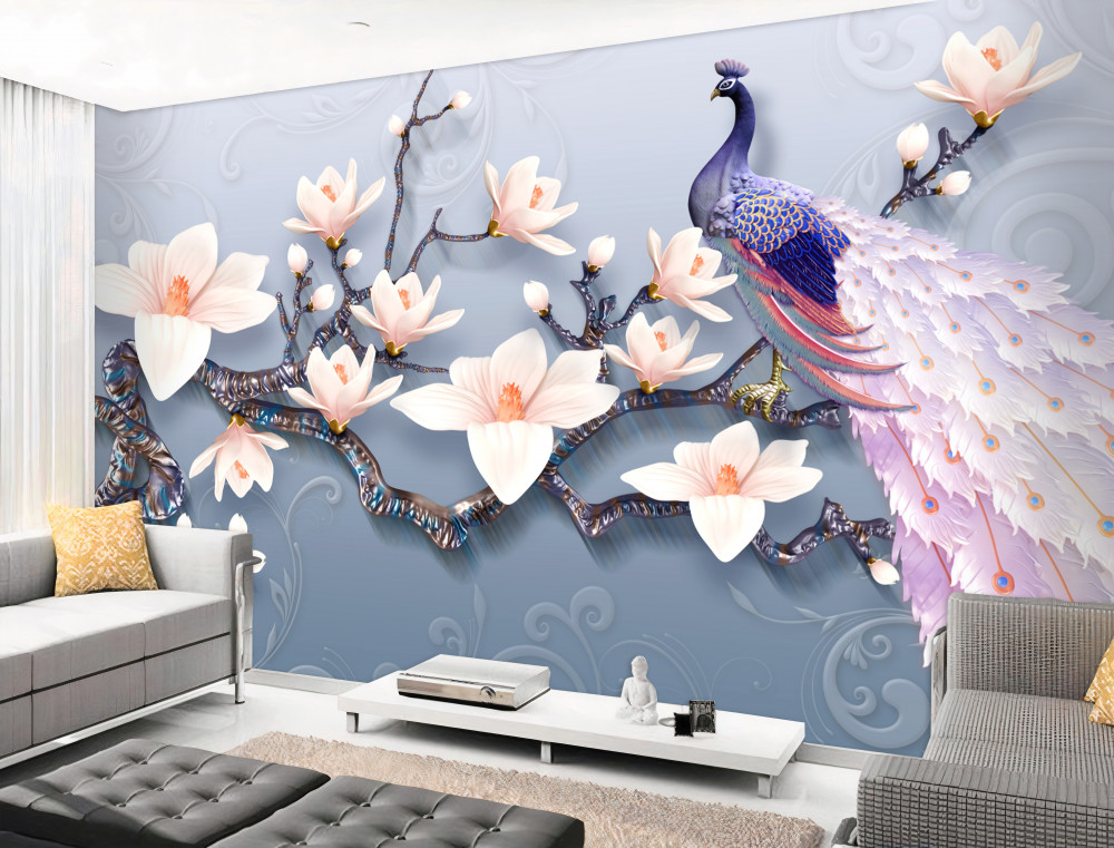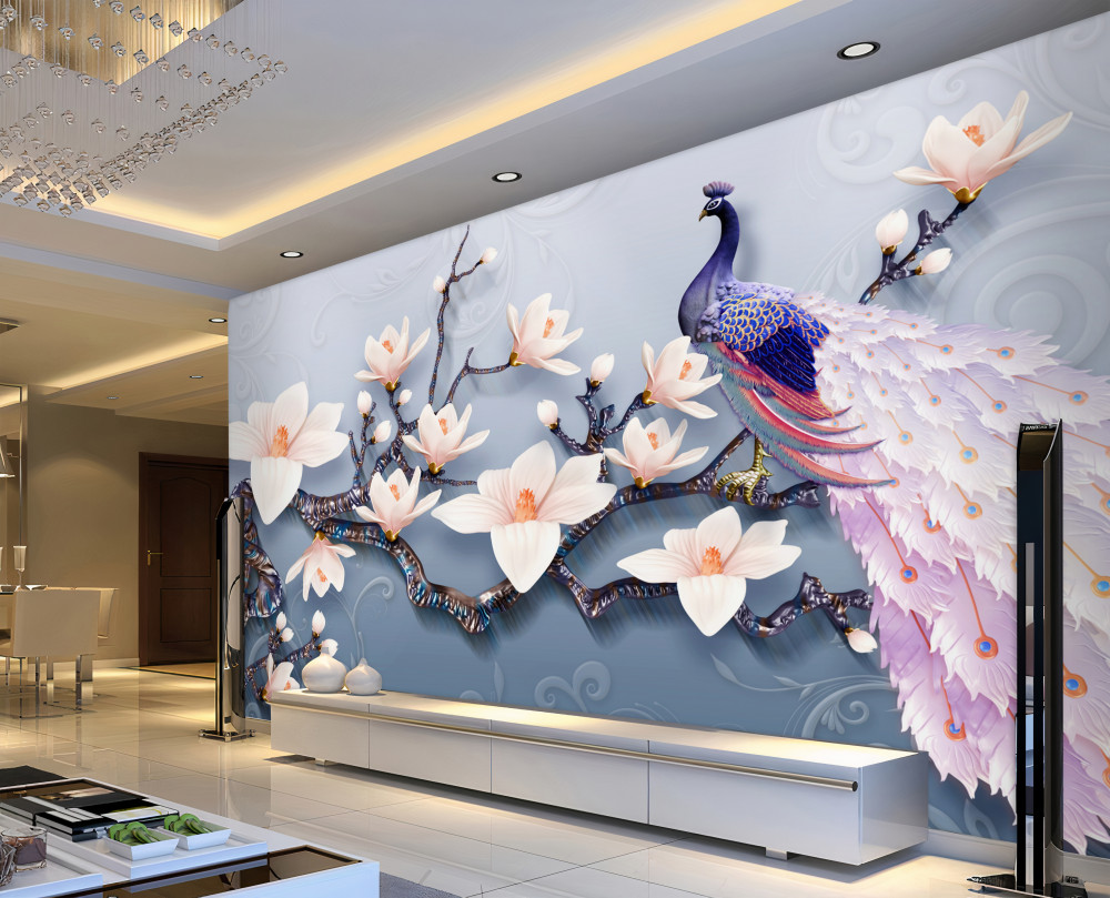 Tapeta Fototapeta wspaniały paw na gałęzi z kwiatami (artykuł a90225 ) z kategorii Fototapety 3D