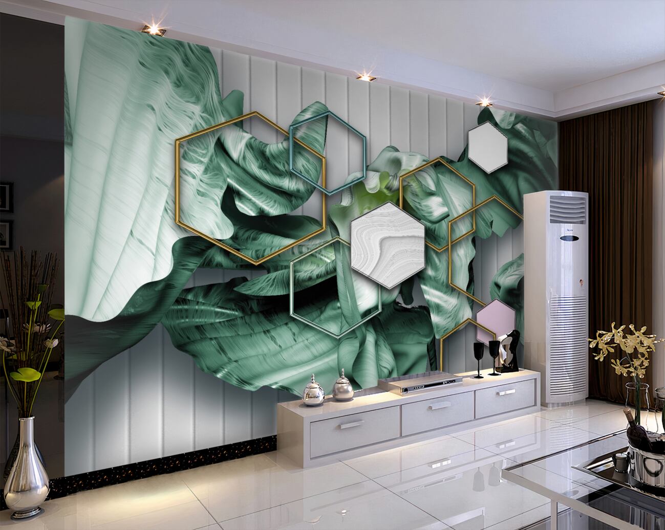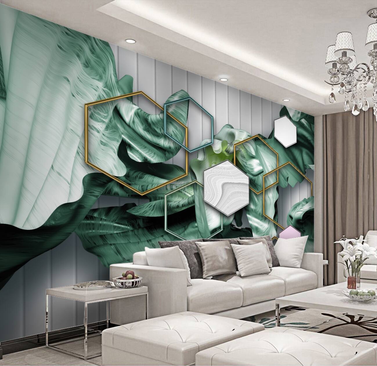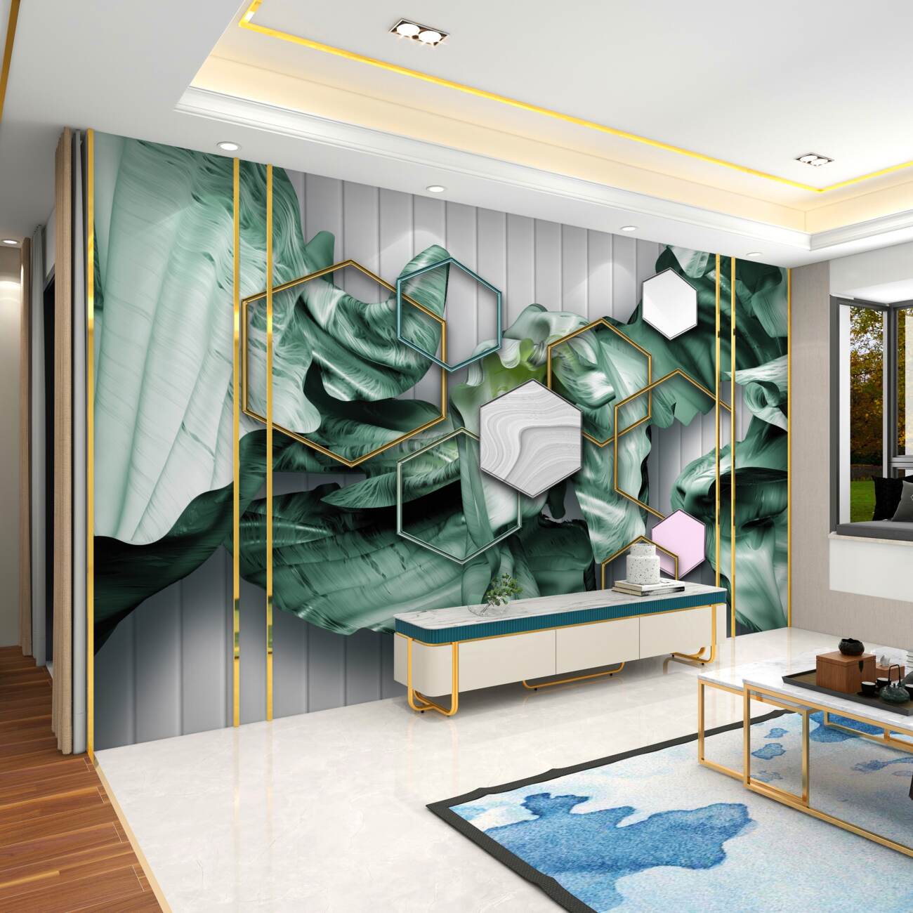 Tapeta Fototapeta Wysokie geometryczne kształty i abstrakcja liści (artykuł u10014 ) z kategorii Fototapety 3D
