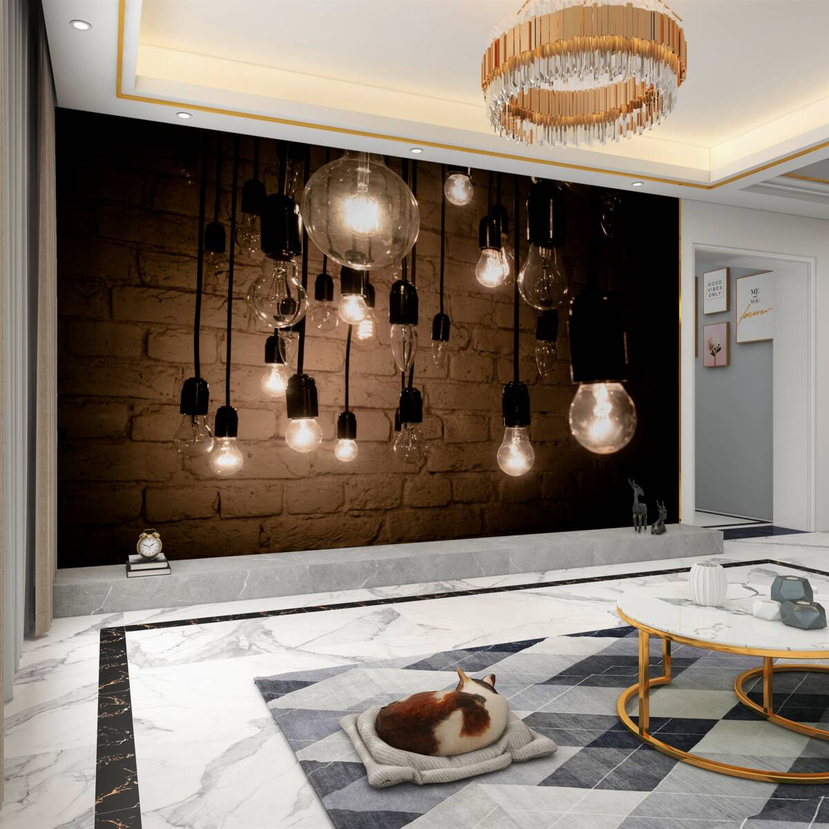Tapeta Fototapeta zapalone żarówki na tle ceglanego muru (artykuł a97583 ) z kategorii Fototapety 3D