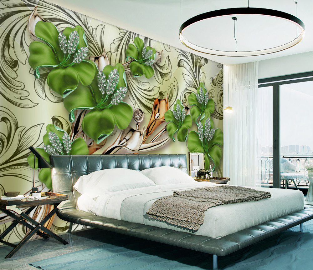 Tapeta Fototapeta zielone kwiaty na złotych gałęziach na jedwabiu (artykuł a91296 ) z kategorii Fototapety 3D