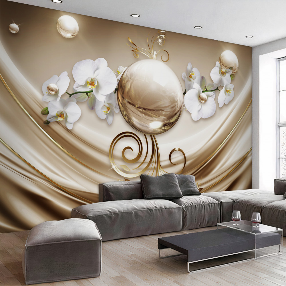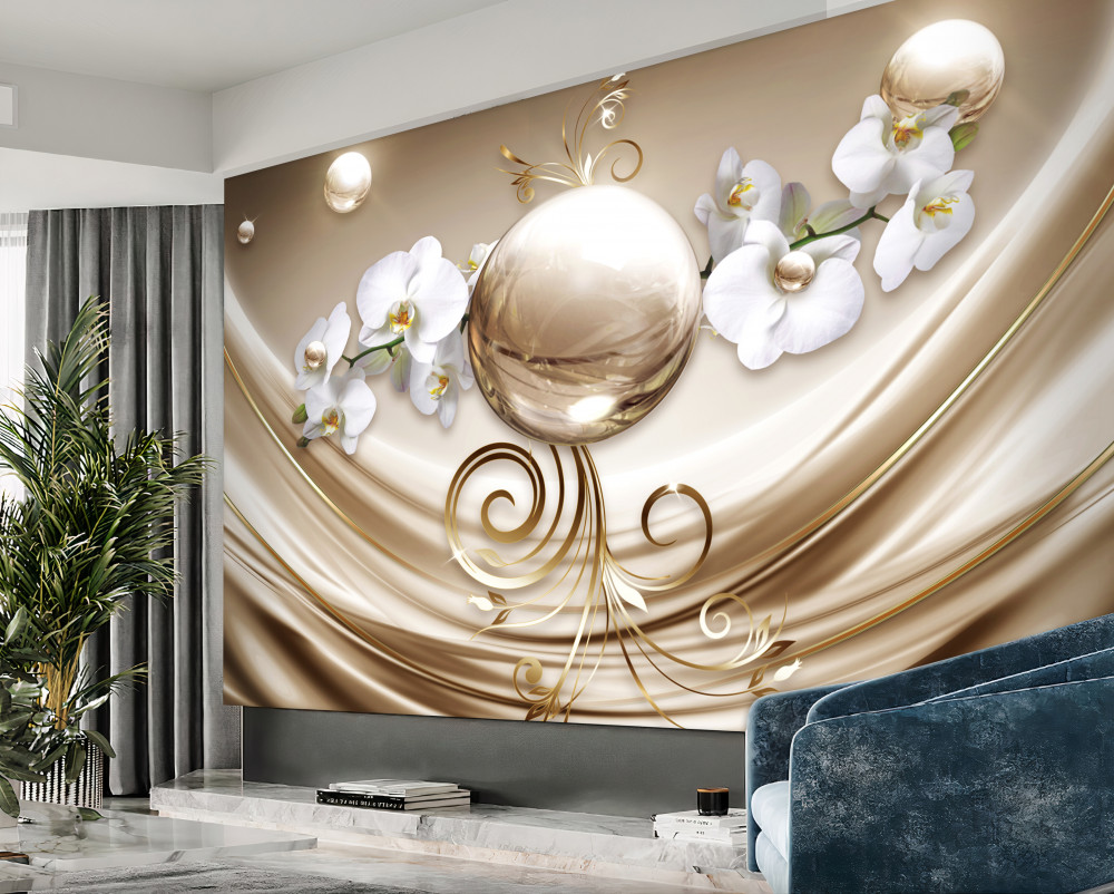 Tapeta Fototapeta złota kula i białe orchidee (artykuł a90707 ) z kategorii Fototapety 3D