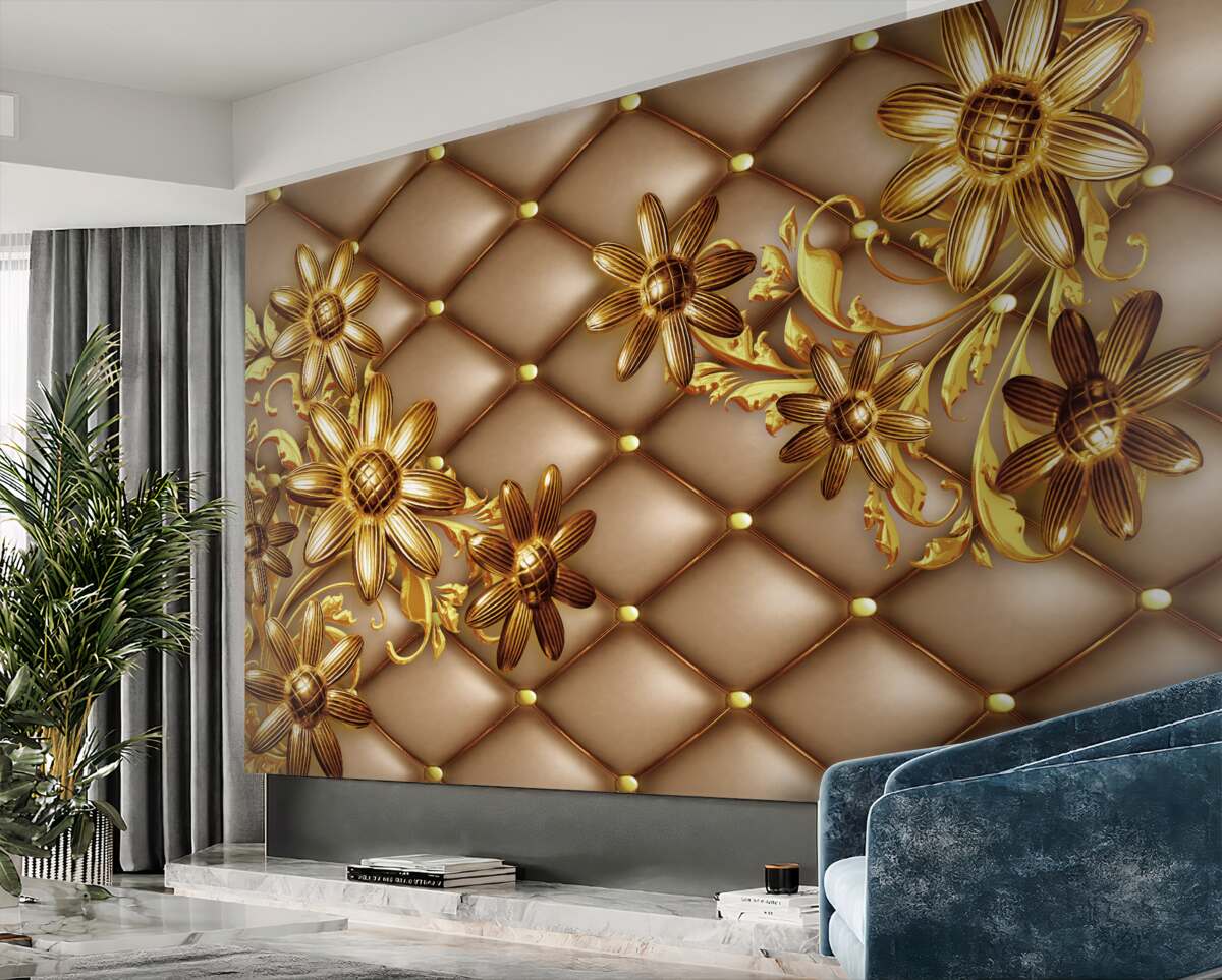 Tapeta Fototapeta Złote kwiaty na tkaninie (artykuł a98773 ) z kategorii Fototapety 3D