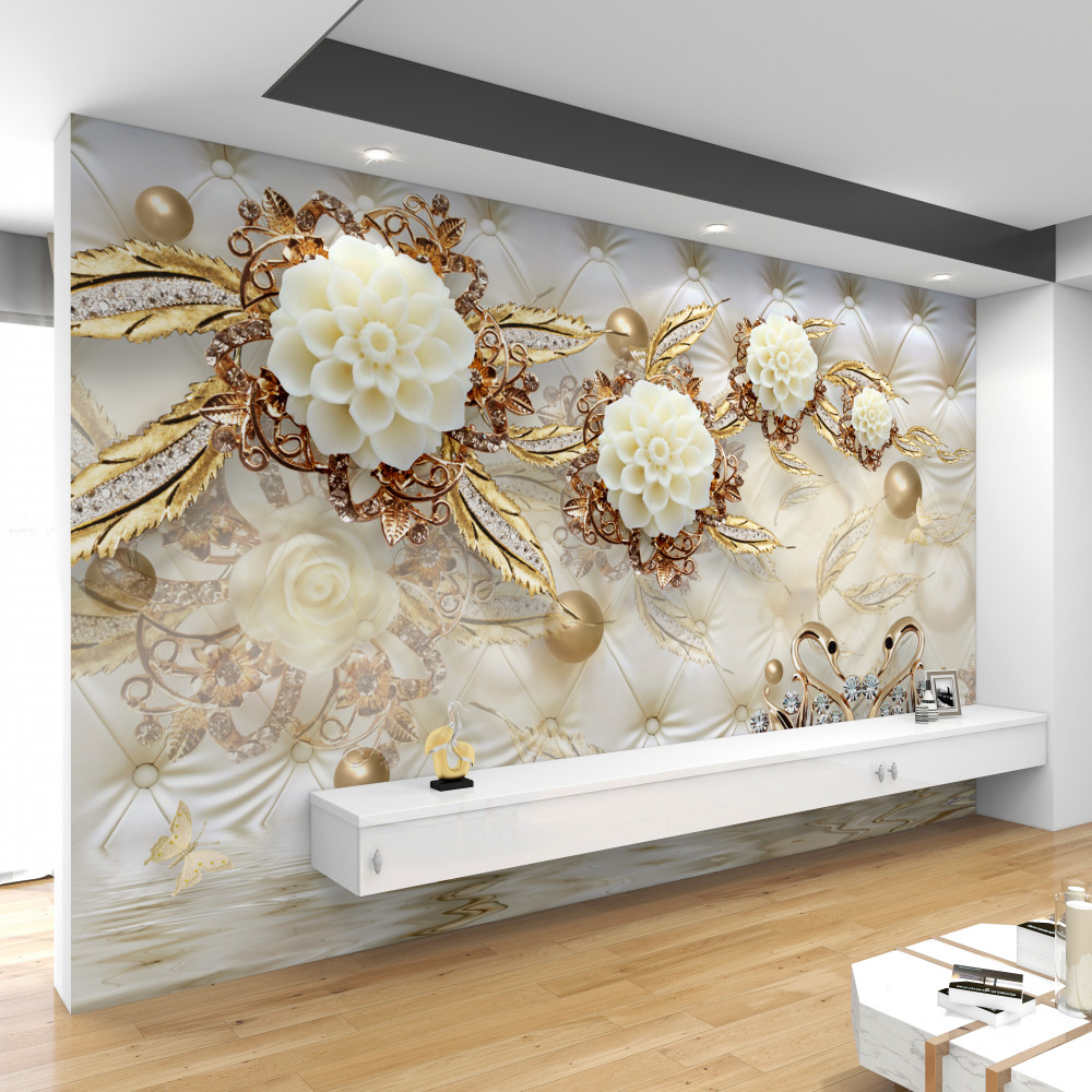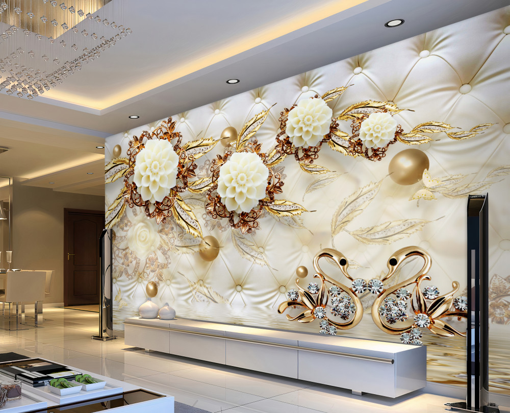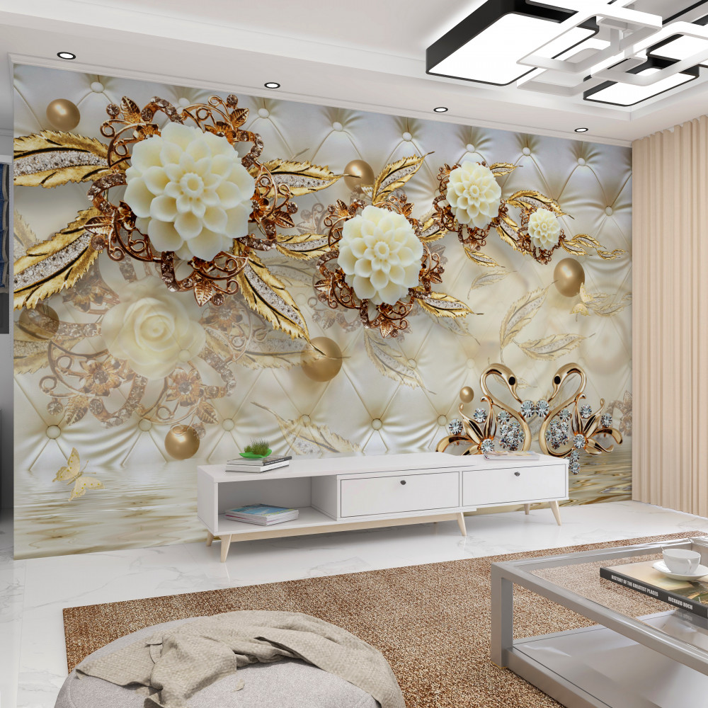 Tapeta Fototapeta złote łabędzie i białe kwiaty na złocie (artykuł a91211 ) z kategorii Fototapety 3D