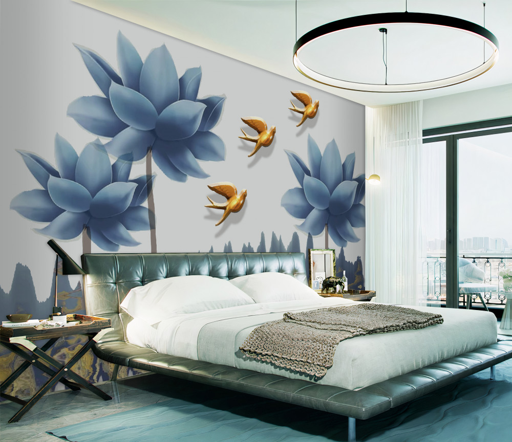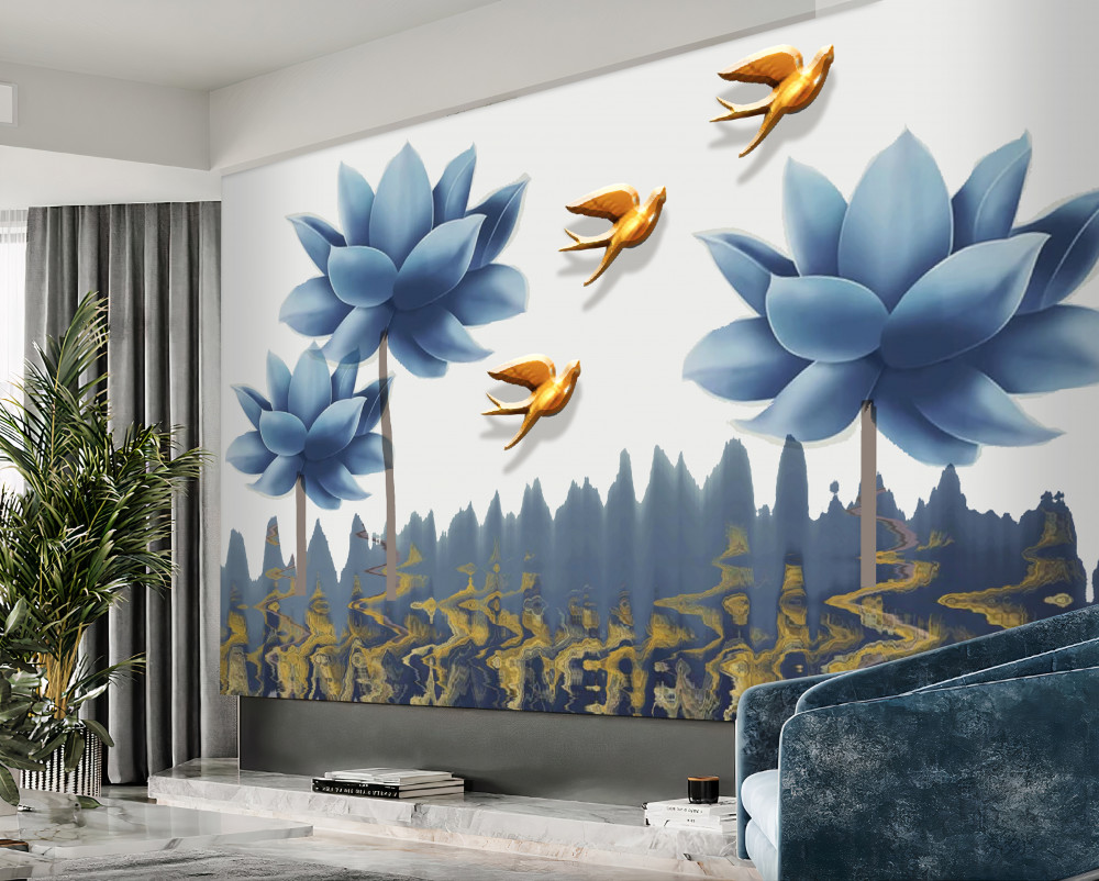 Tapeta Fototapeta złote ptaki latają nad kwiecistą łąką (artykuł pb8910 ) z kategorii Fototapety 3D