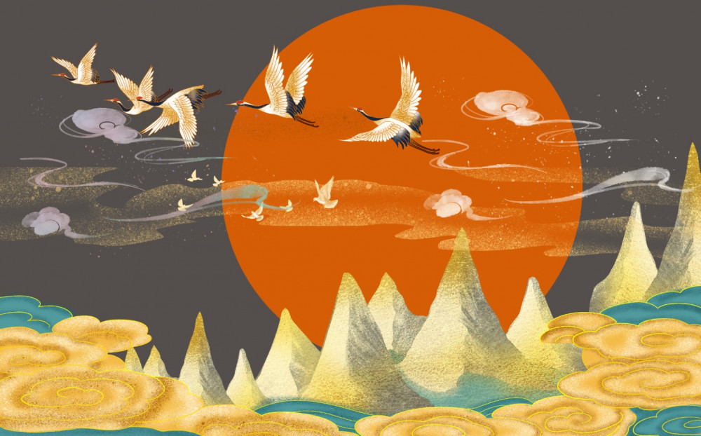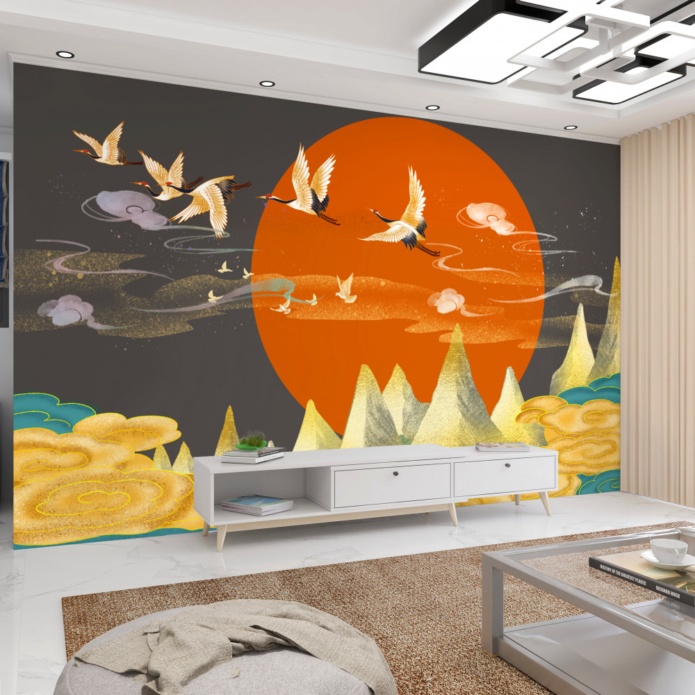 Tapeta Fototapeta żurawie opuszczają dom nad górami (artykuł a92054 ) z kategorii Fototapety 3D