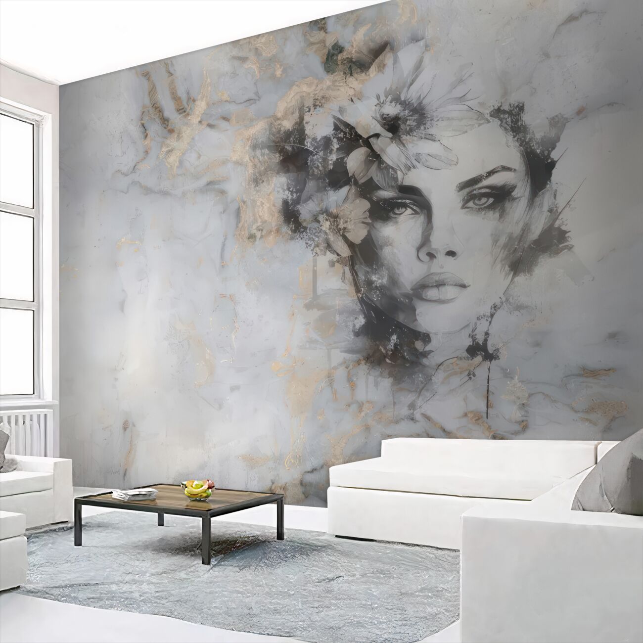 Tapeta Fototapeta Twarz dziewczyny w czarnych białych kwiatach (artykuł a99565 ) z kategorii Fototapety Abstrakcja