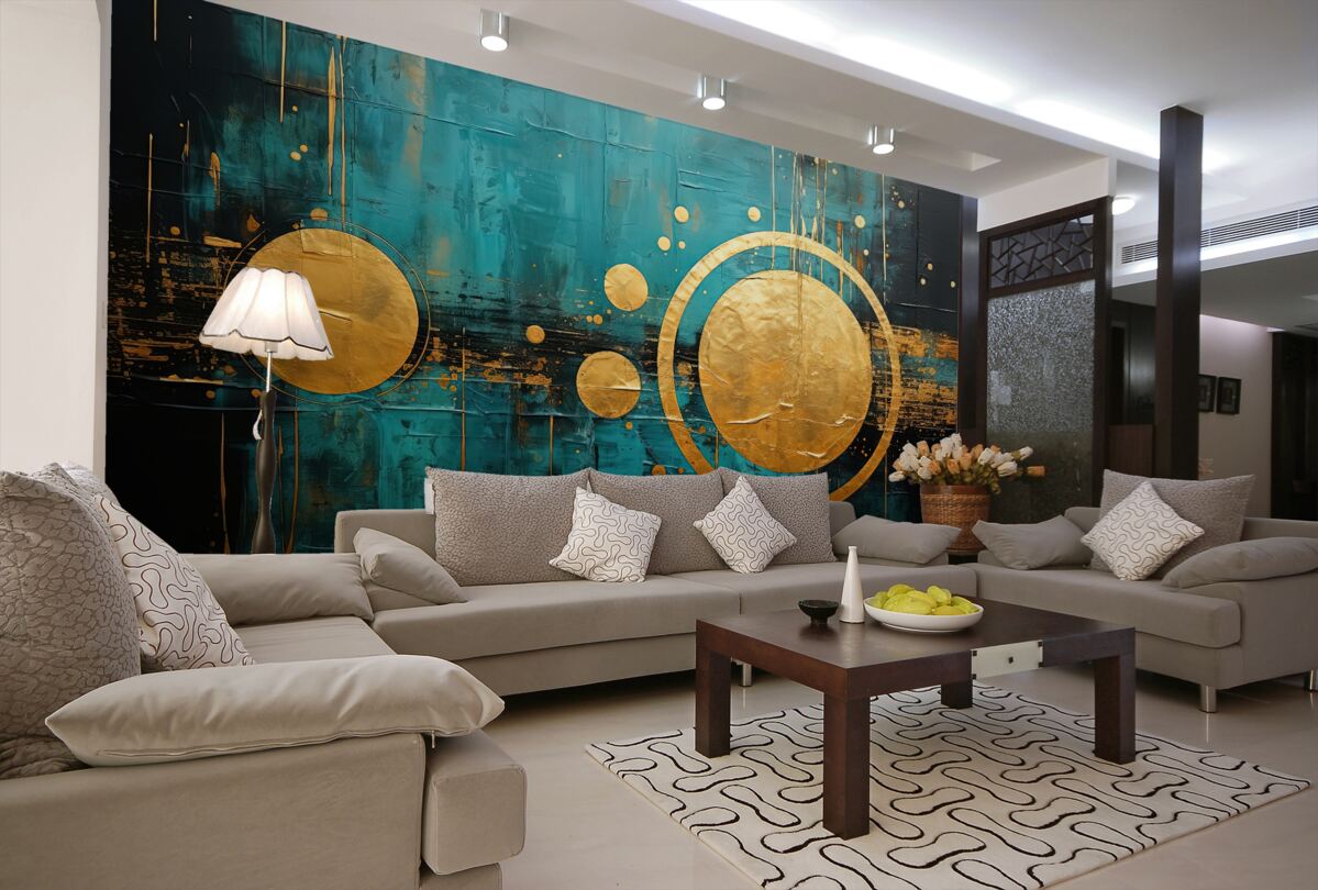 Tapeta Fototapeta Złote kółka na turkusowym tle (artykuł a94046 ) z kategorii Fototapety Abstrakcja