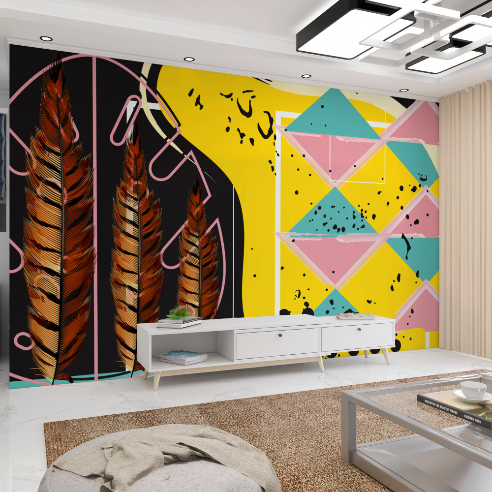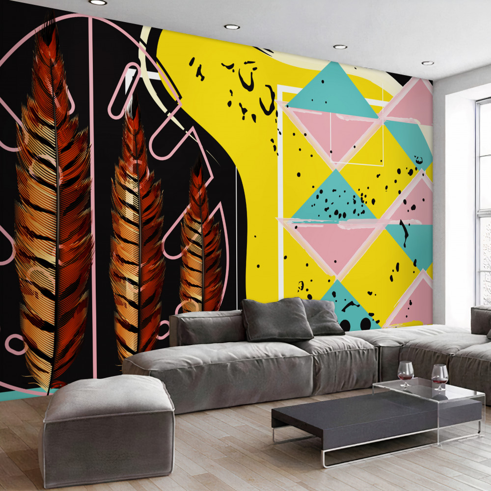 Tapeta Fototapeta żółte kłoski na tle geometrycznych kształtów (artykuł pb3356 ) z kategorii Fototapety Abstrakcja