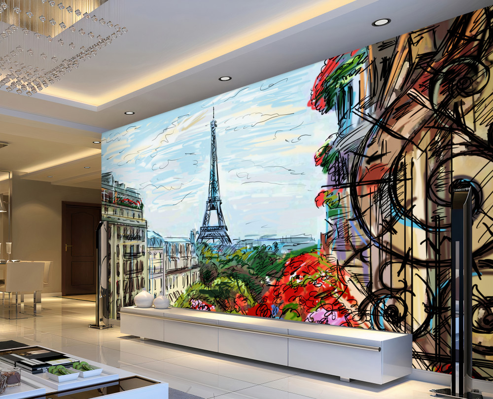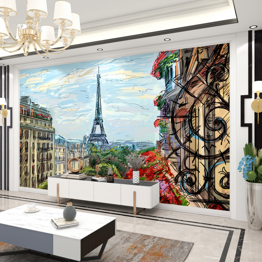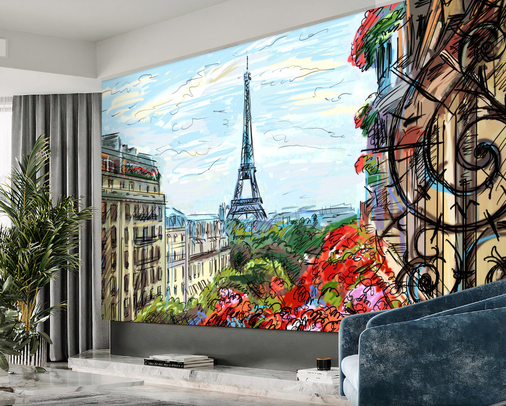 Tapeta Fototapeta kolorowy widok na Wieżę Eiffla z balkonu (artykuł a89760 ) z kategorii Fototapety Akwarele