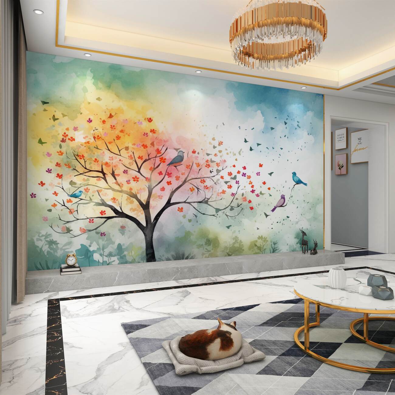 Tapeta Fototapeta Ptaki w kwitnące drzewie latem (artykuł a99944 ) z kategorii Fototapety Akwarele