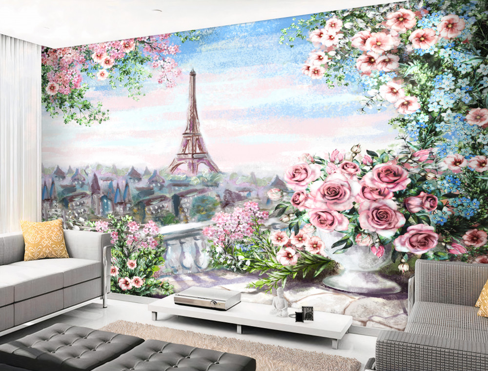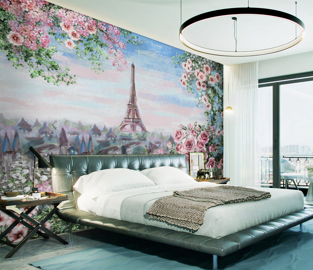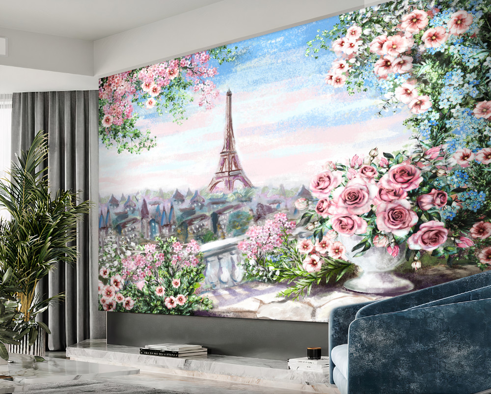 Tapeta Fototapeta różowe kwiaty w ogrodzie przed Wieżą Eiffla (artykuł a93060 ) z kategorii Fototapety Akwarele