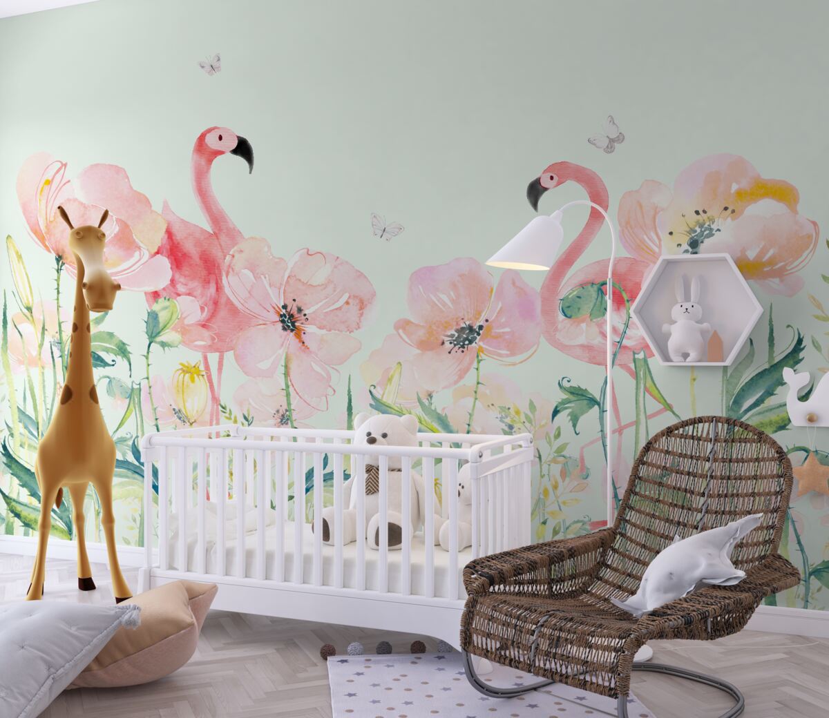 Tapeta Fototapeta Różowy flaming w różowych kwiatach (artykuł a96583 ) z kategorii Fototapety Akwarele