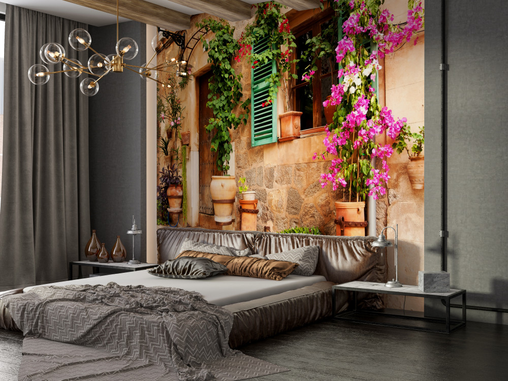Tapeta Fototapeta kwiaty w doniczkach na starej ulicy (artykuł a89751 ) z kategorii Fototapety Architektura