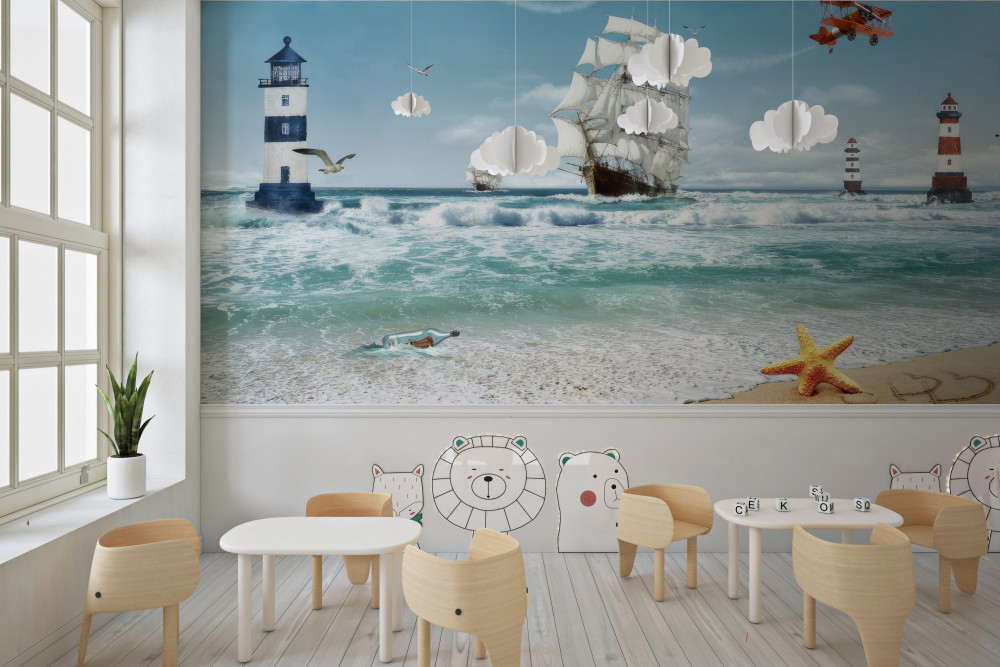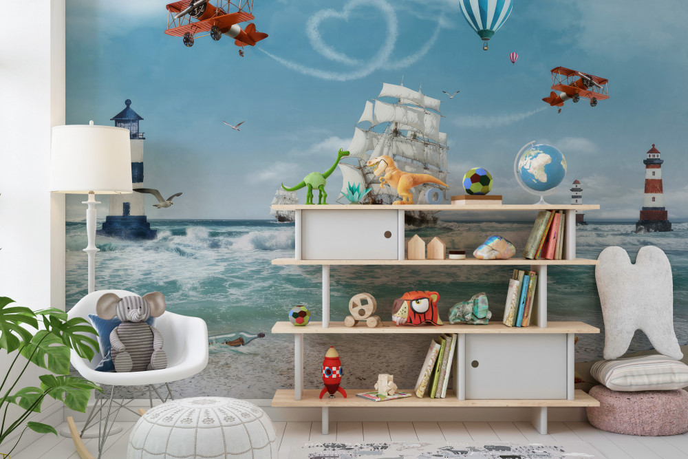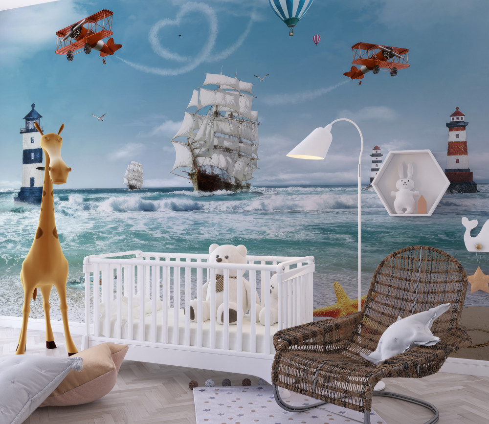 Tapeta Fototapeta brygantyny na tle latarni morskich i samolotów (artykuł a90037 ) z kategorii Fototapety dla Chłopców