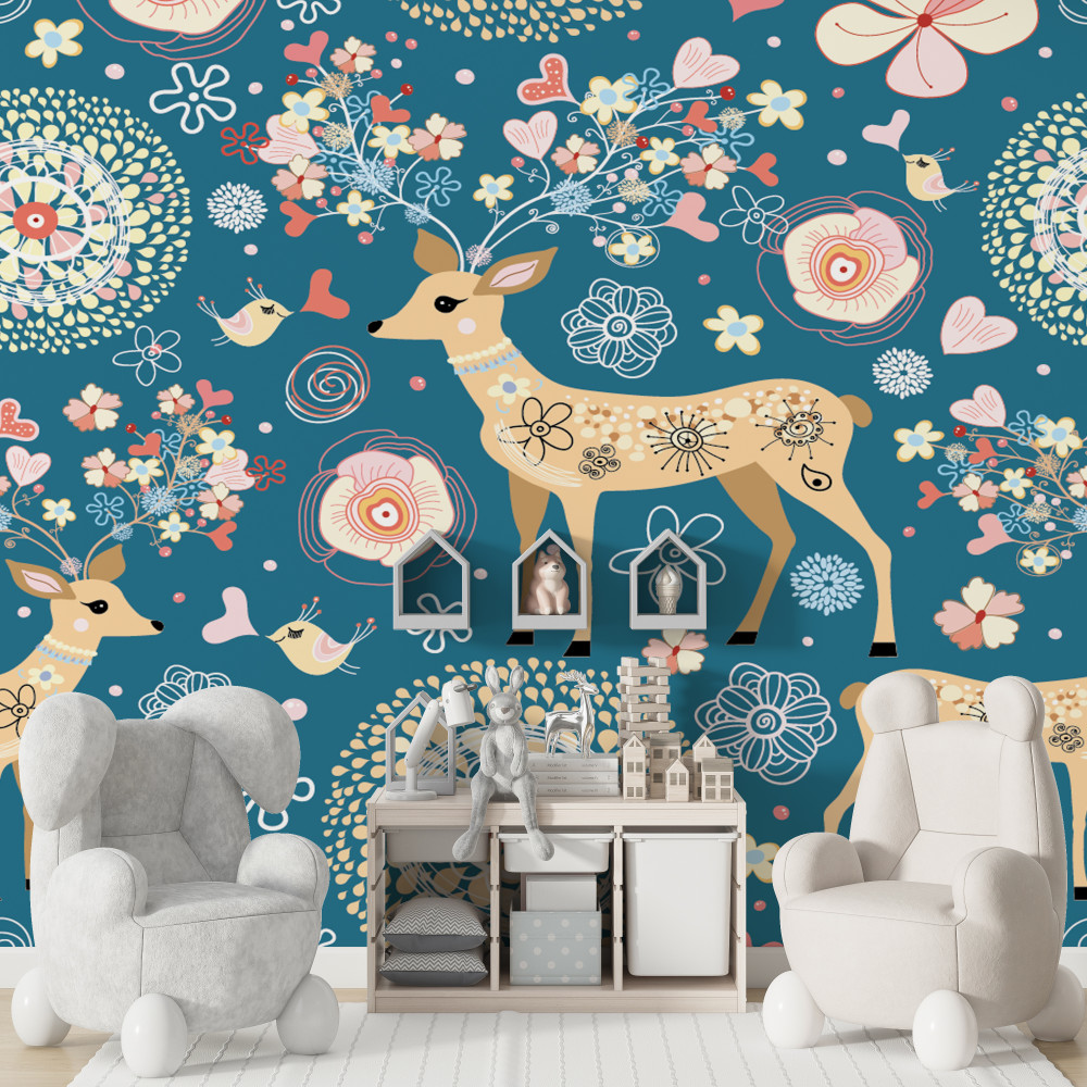 Tapeta Fototapeta jelenie i ptaki w kwiatach (artykuł a92306 ) z kategorii Fototapety dla Chłopców