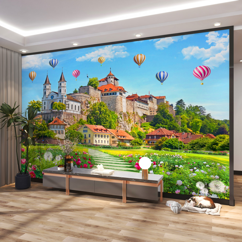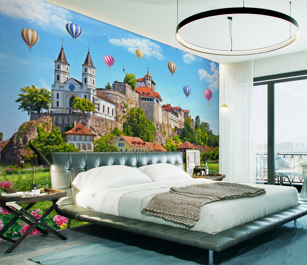 Tapeta Fototapeta kolorowe balony na ogrzane powietrze nad miastem (artykuł a89204 ) z kategorii Fototapety dla Chłopców