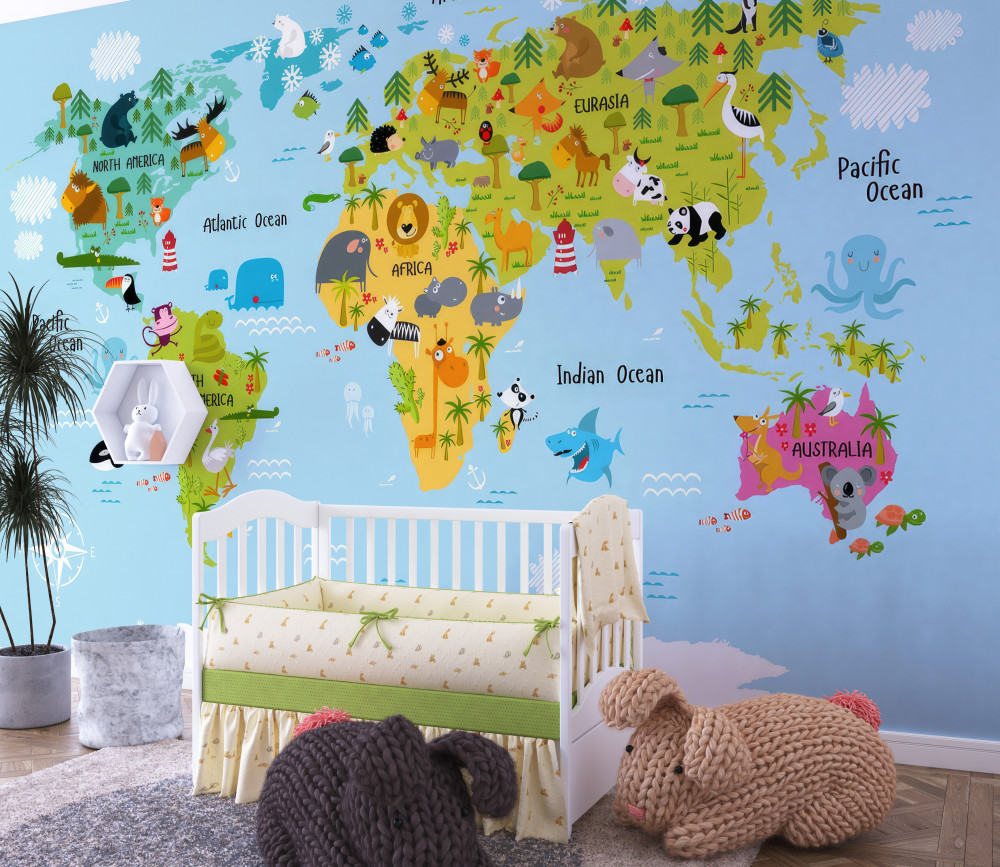 Tapeta Fototapeta mapa świata dla dzieci ze zwierzętami (artykuł a91480 ) z kategorii Fototapety dla Chłopców