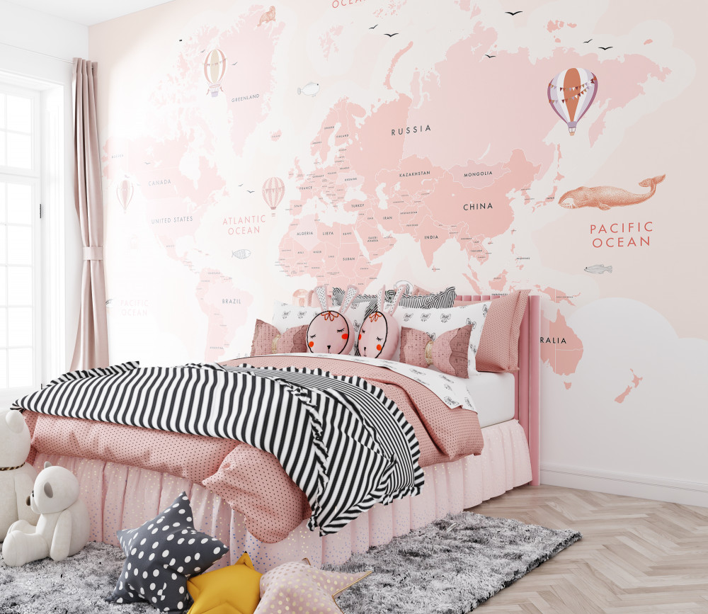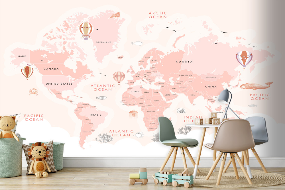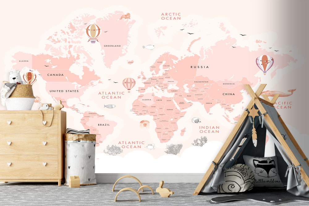 Tapeta Fototapeta mapa świata w kolorze różowym (artykuł a90238 ) z kategorii Fototapety dla Chłopców