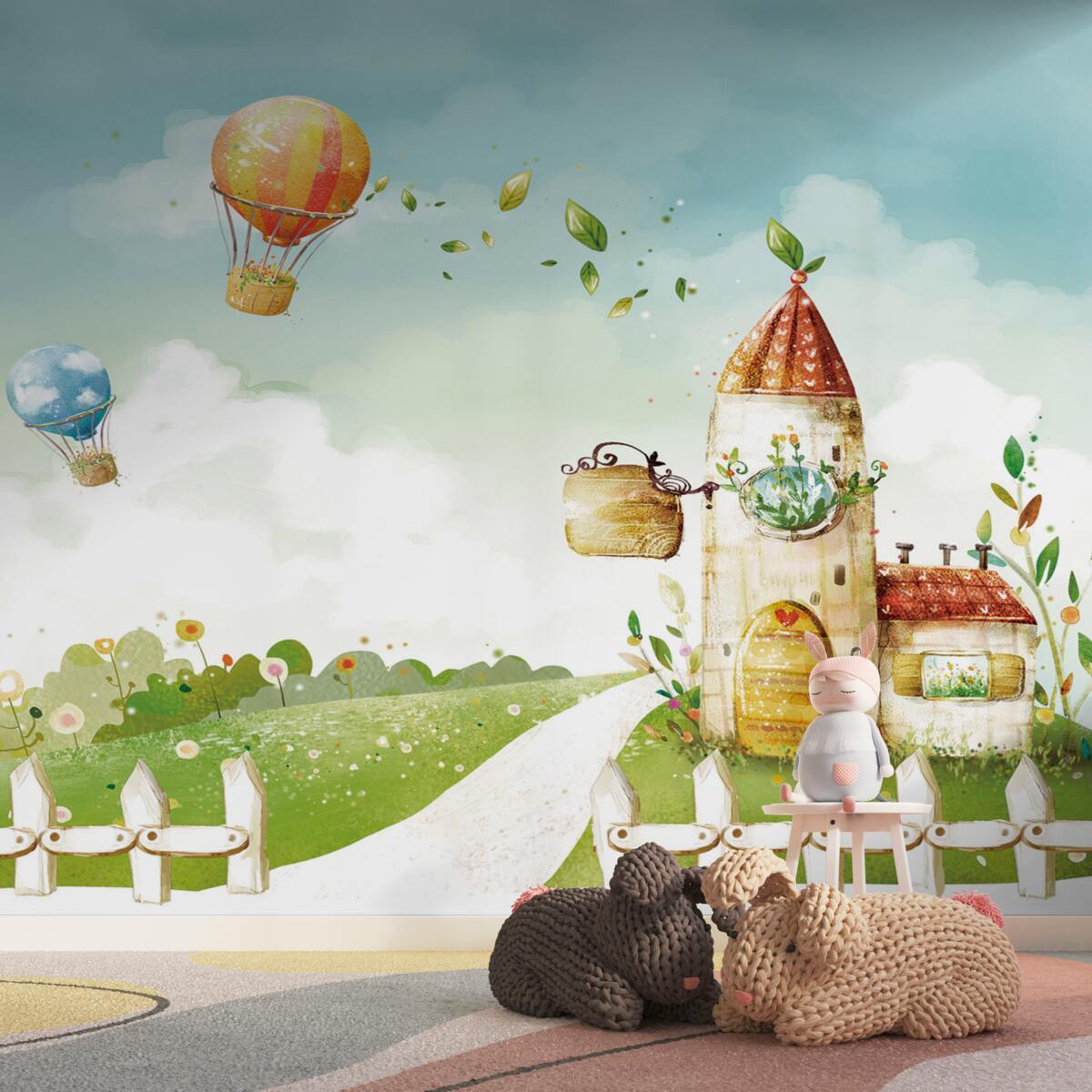 Tapeta Fototapeta Balony na ogrzane powietrze przelatują nad wiejskim domem (artykuł a96715 ) z kategorii Fototapety dla Dzieci