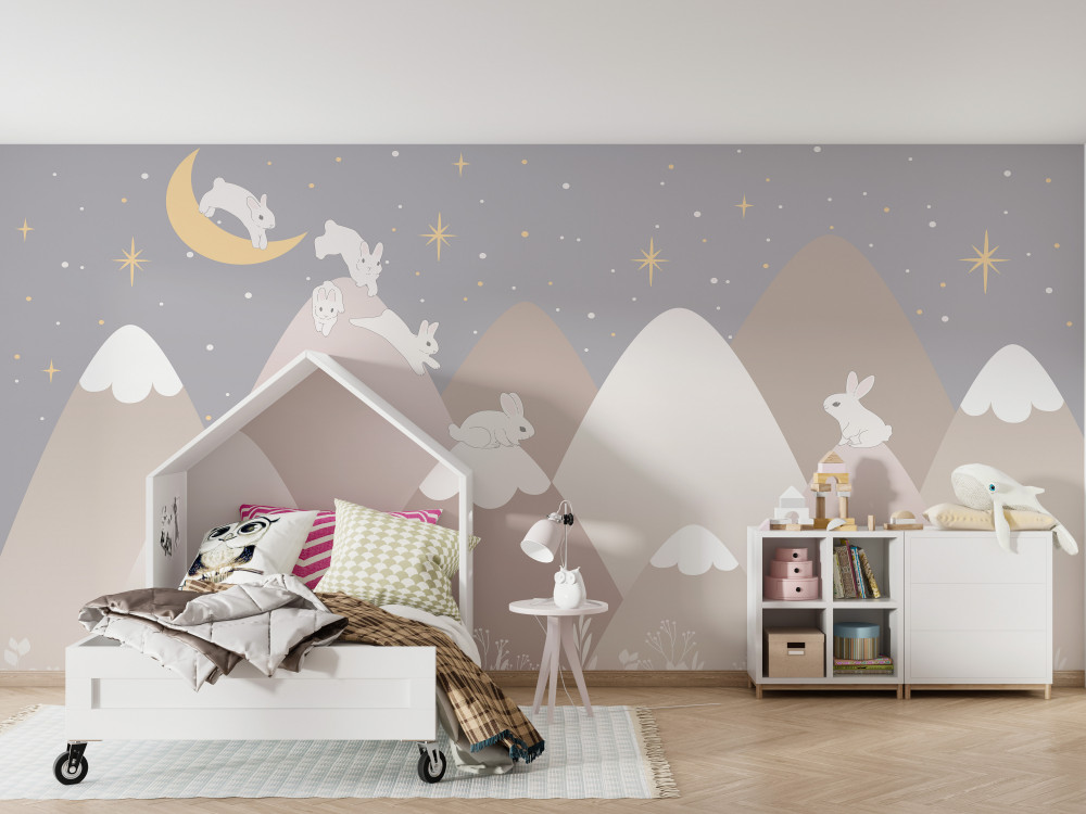 Tapeta Fototapeta białe króliczki skaczące po malowanych górach (artykuł a93901 ) z kategorii Fototapety dla Dzieci
