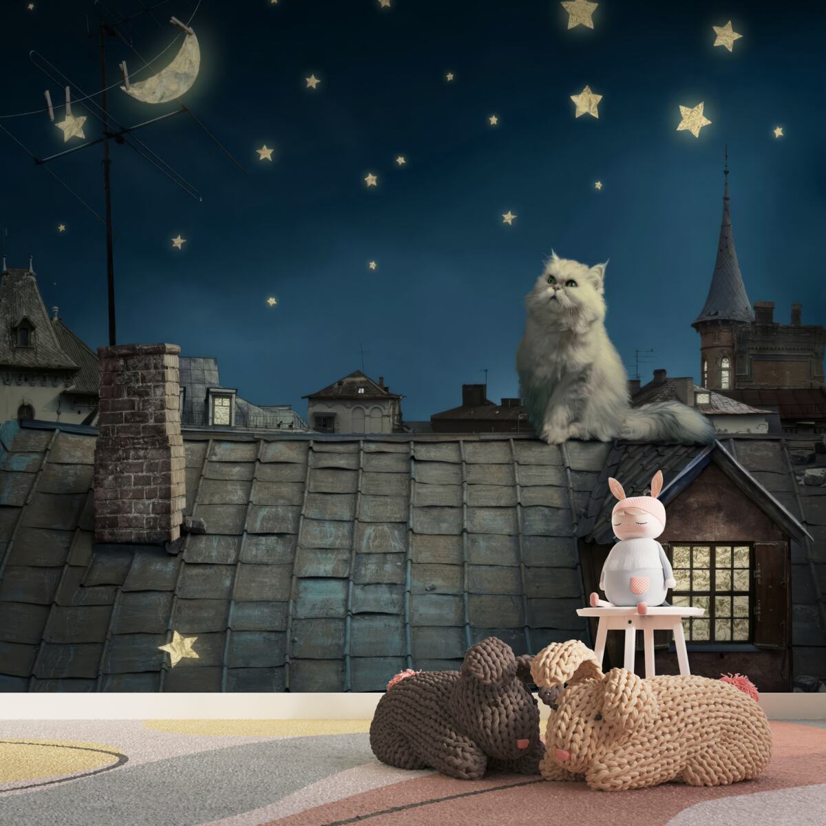 Tapeta Fototapeta Biały kot na dachu cieszy się gwiazdami (artykuł a97864 ) z kategorii Fototapety dla Dzieci
