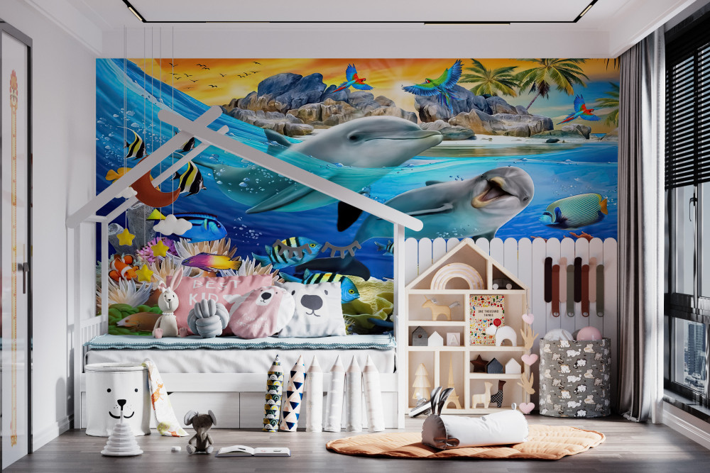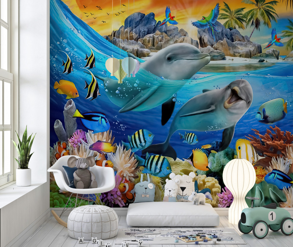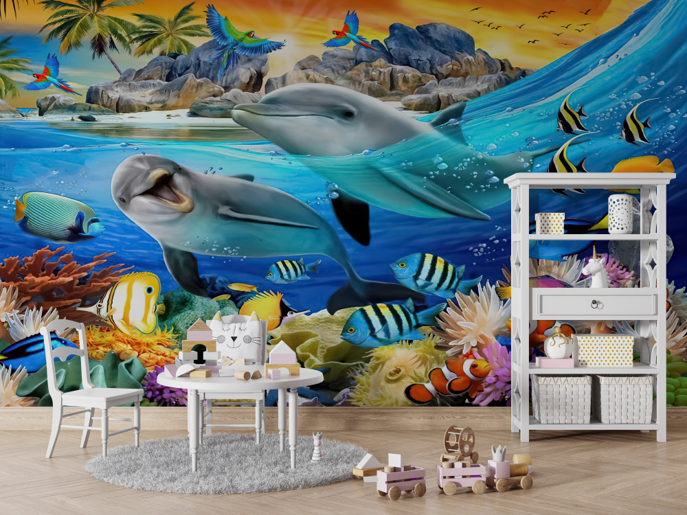 Tapeta Fototapeta delfiny wychodzą z wody (artykuł a93928 ) z kategorii Fototapety dla Dzieci