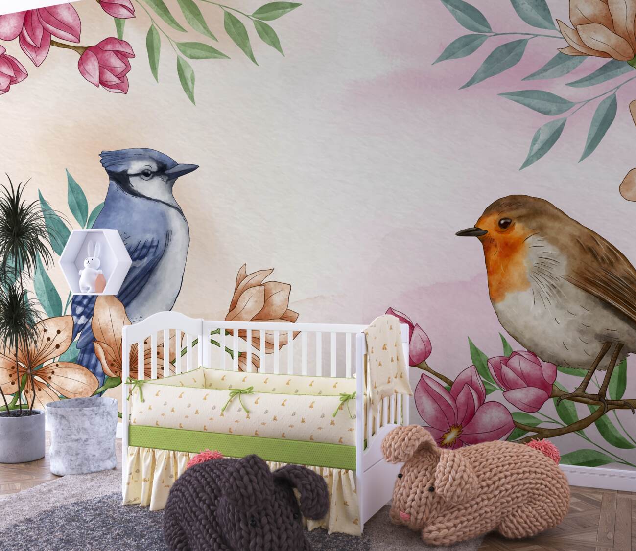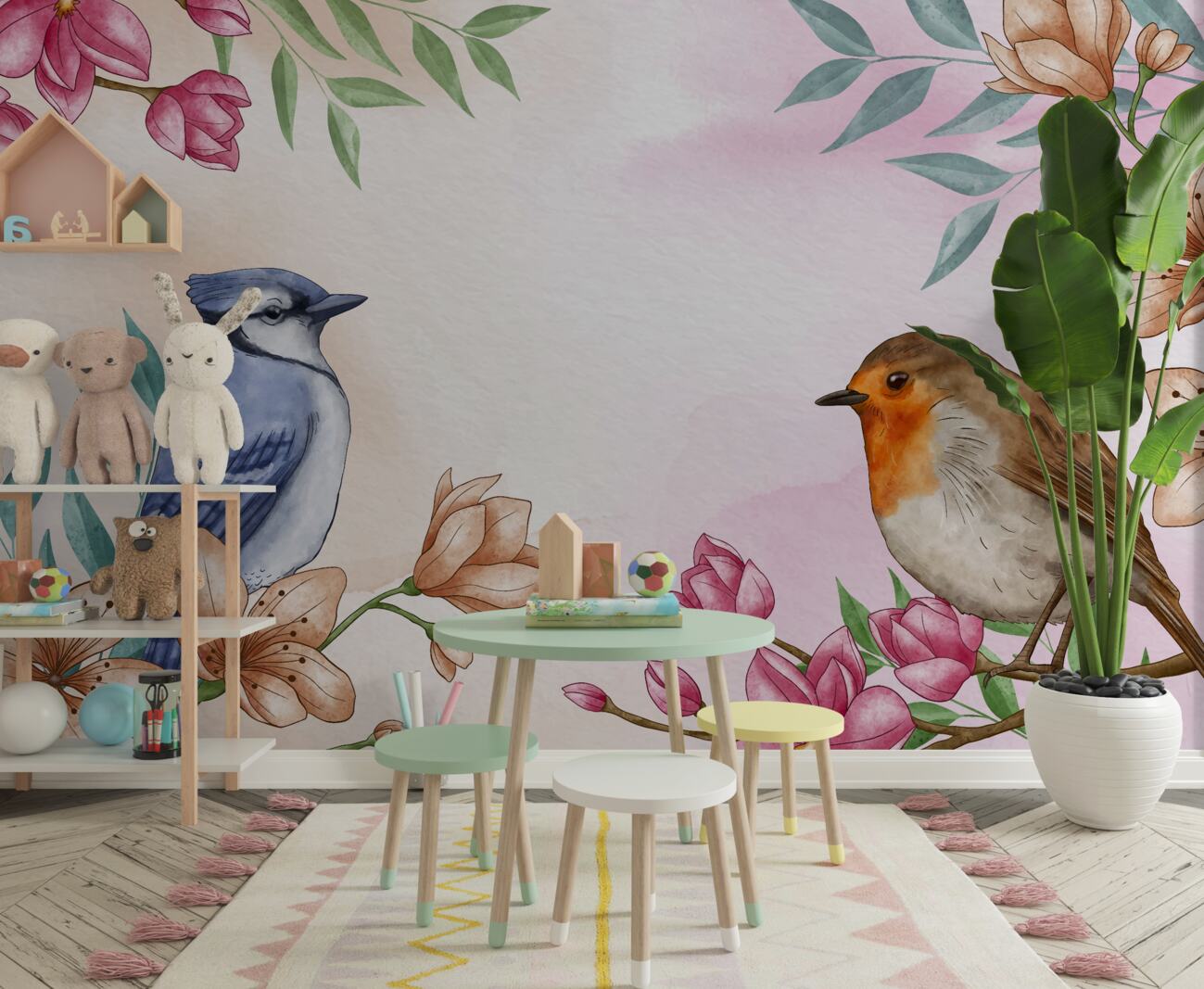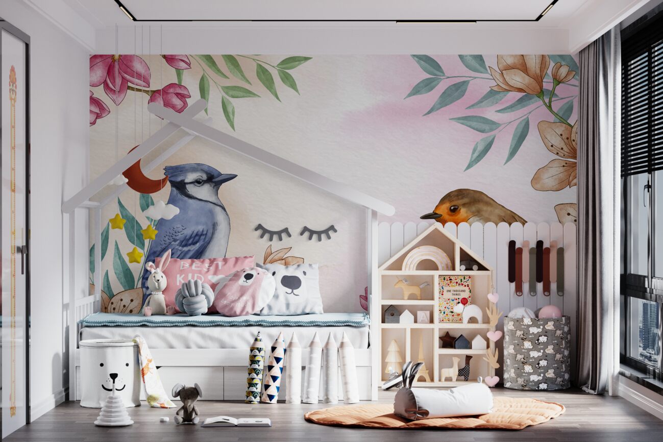 Tapeta Fototapeta Dwa ptaki siedzą na kwitnących gałęziach (artykuł u13978 ) z kategorii Fototapety dla Dzieci