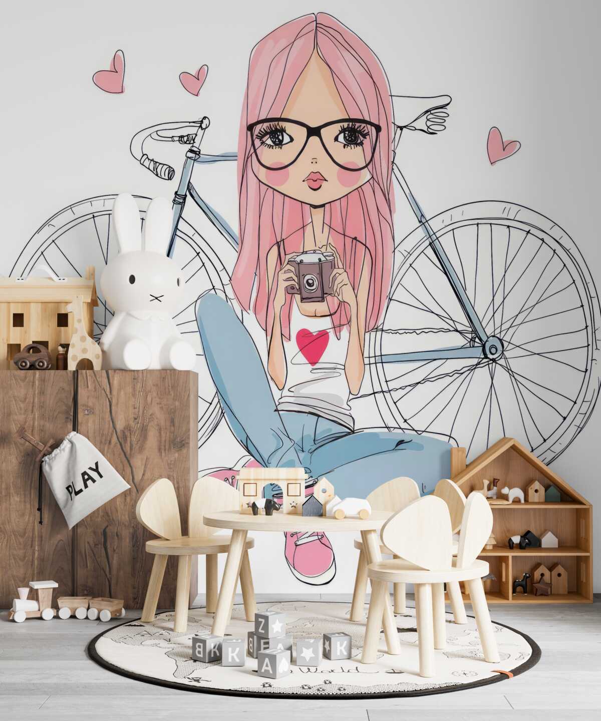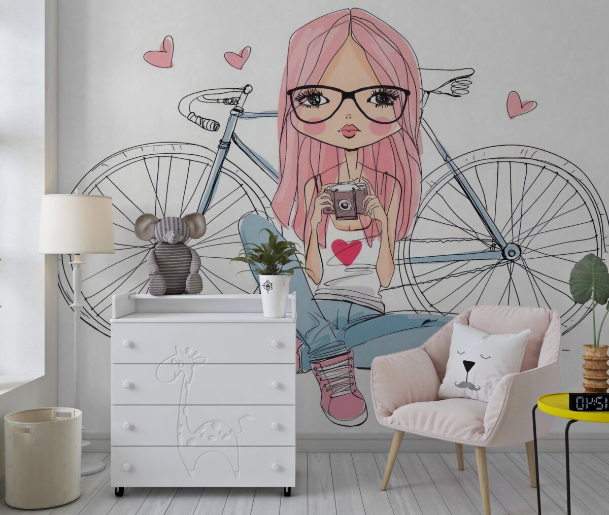 Tapeta Fototapeta Dziewczyna opiera się na rowerze z aparatem w dłoniach (artykuł a97765 ) z kategorii Fototapety dla Dzieci