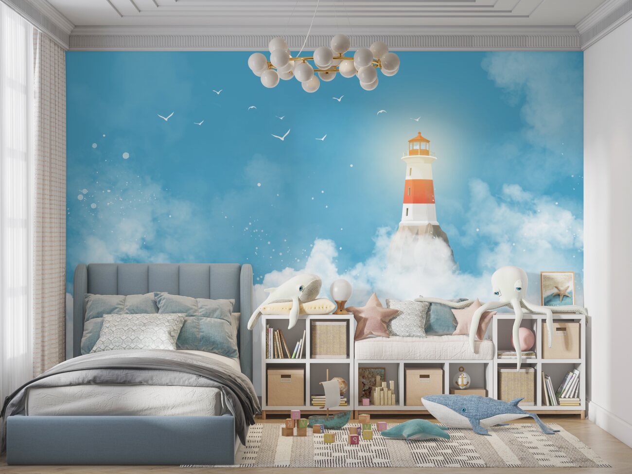Tapeta Fototapeta Górna część latarnia wygląda z chmur (artykuł a100170 ) z kategorii Fototapety dla Dzieci