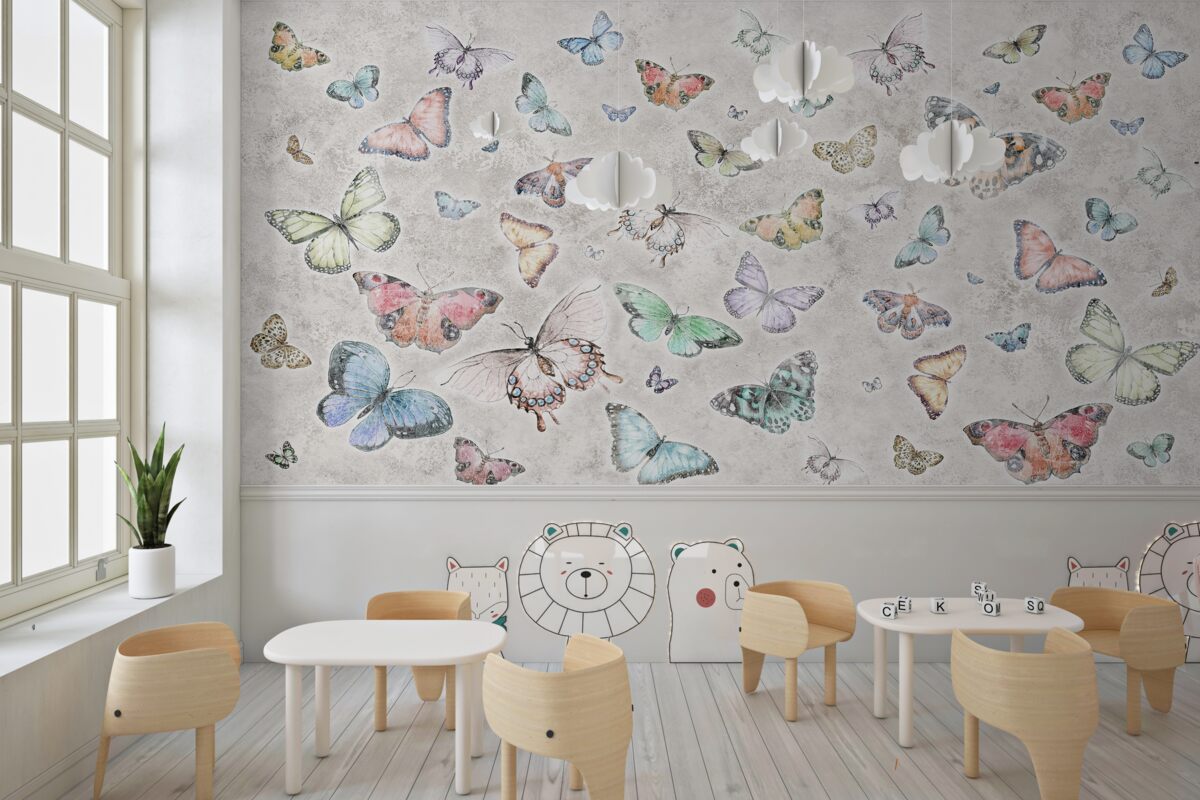 Tapeta Fototapeta Jasne motyle na szarym tle (artykuł a99005 ) z kategorii Fototapety dla Dzieci