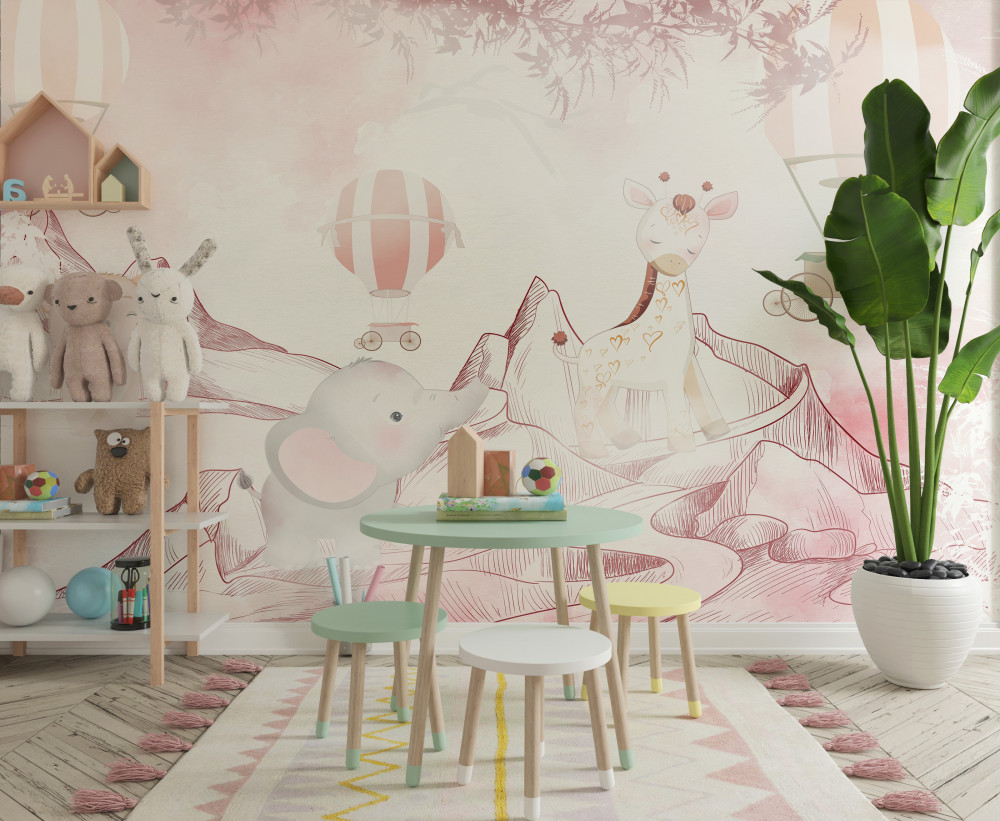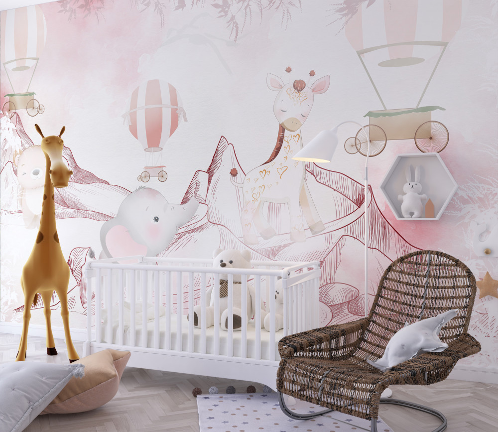Tapeta Fototapeta jasnoróżowe zwierzęta i balony (artykuł a93913 ) z kategorii Fototapety dla Dzieci