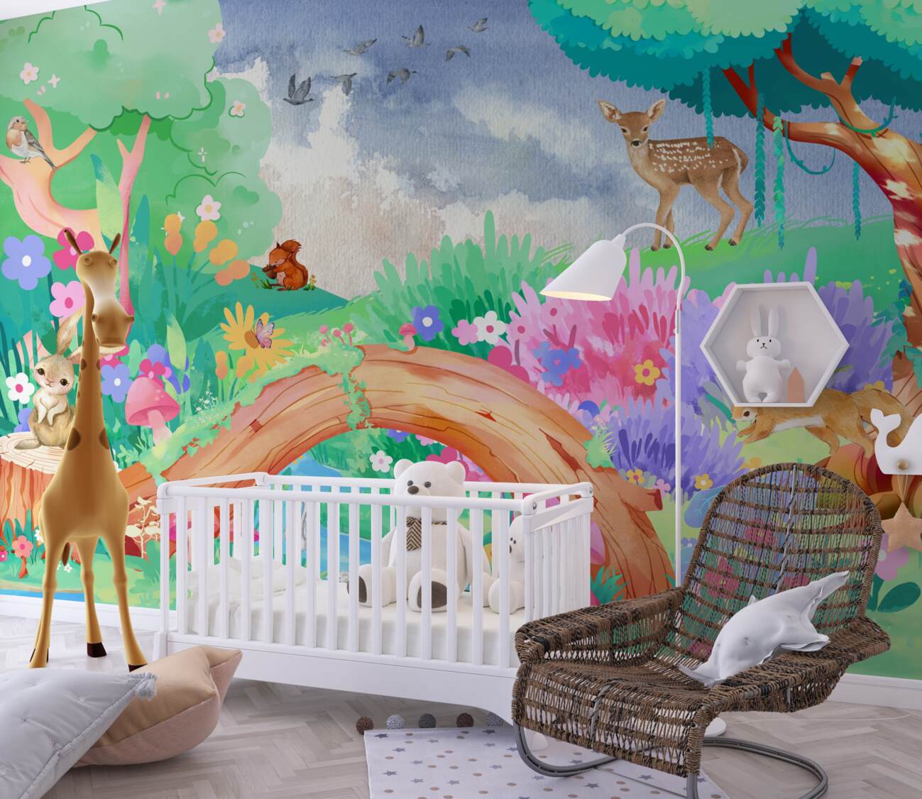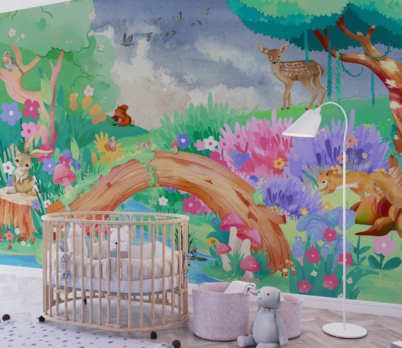 Tapeta Fototapeta Jasny leśny bar z zwierzętami i łabędzi (artykuł a100079 ) z kategorii Fototapety dla Dzieci