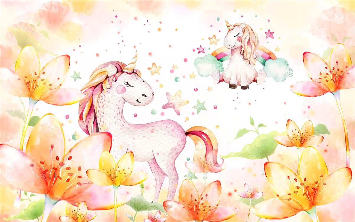 Tapeta Fototapeta Jednorożce z zamkniętymi oczami w kwiatach (artykuł a97276 ) z kategorii Fototapety dla Dzieci