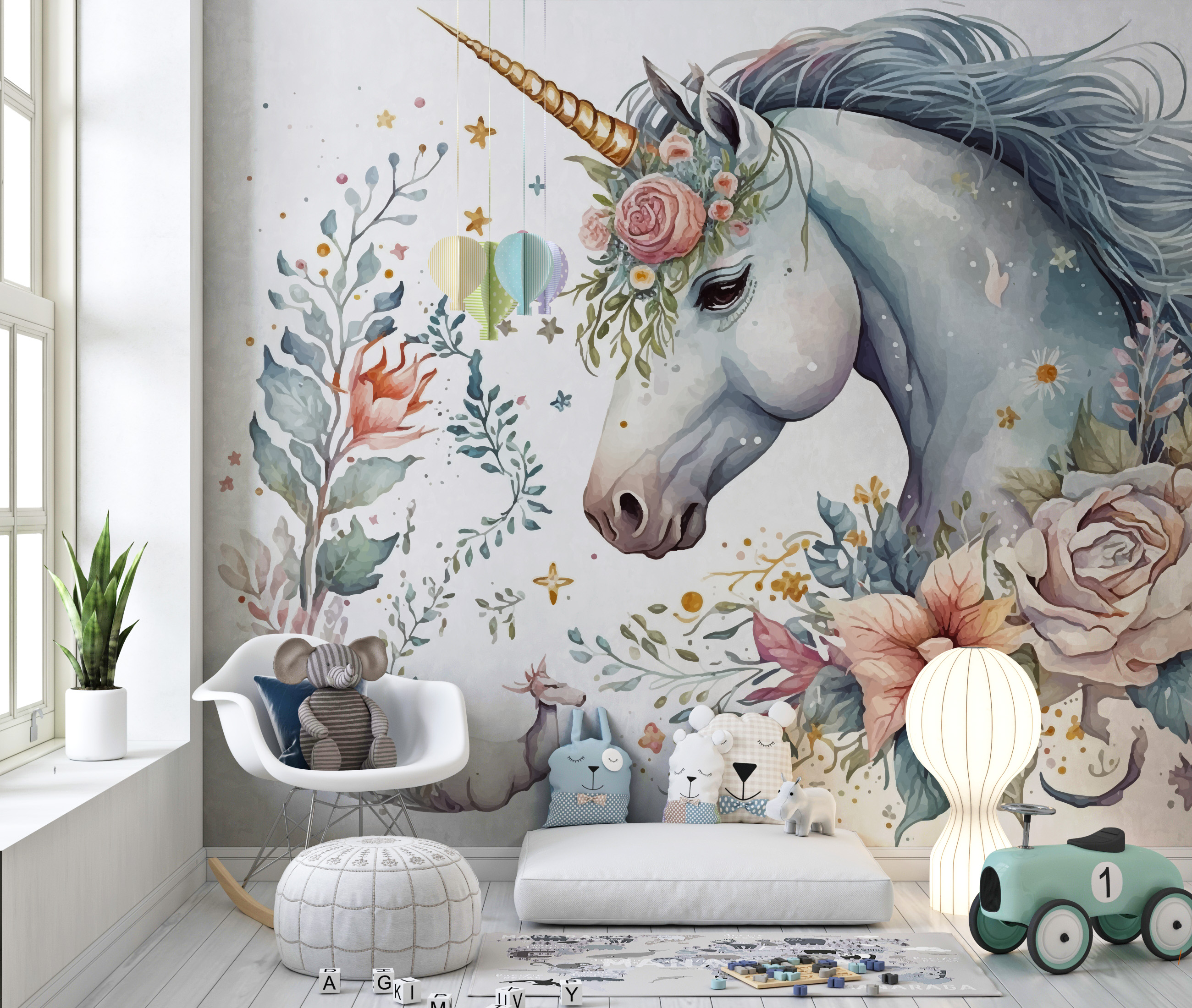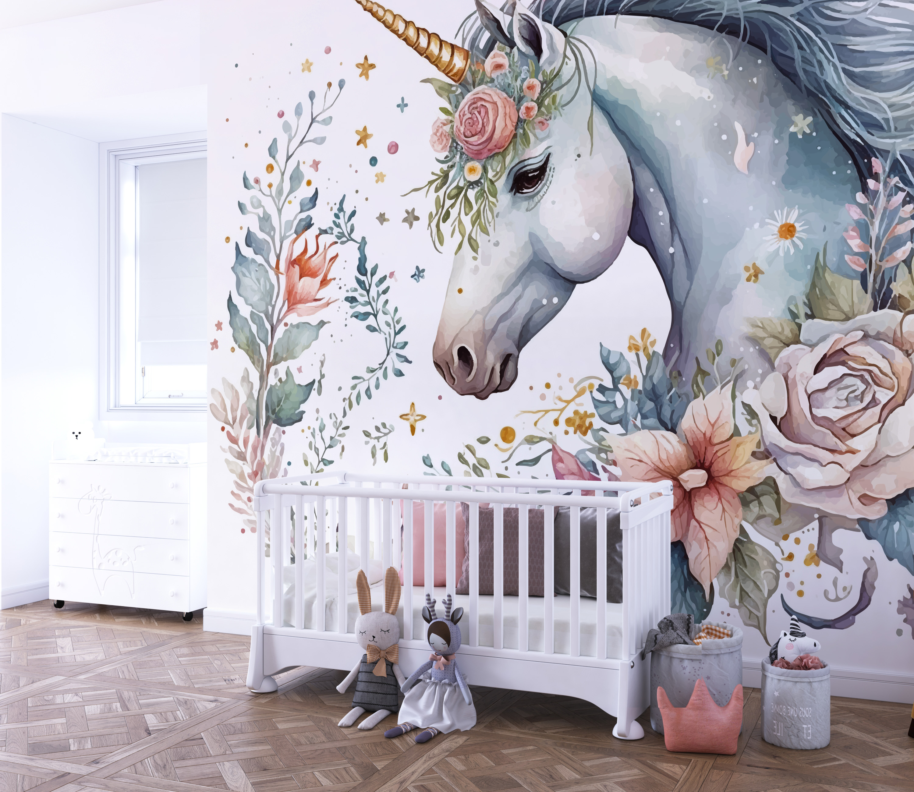 Tapeta Fototapeta Jednorożec w kwiatach (artykuł a94034 ) z kategorii Fototapety dla Dzieci