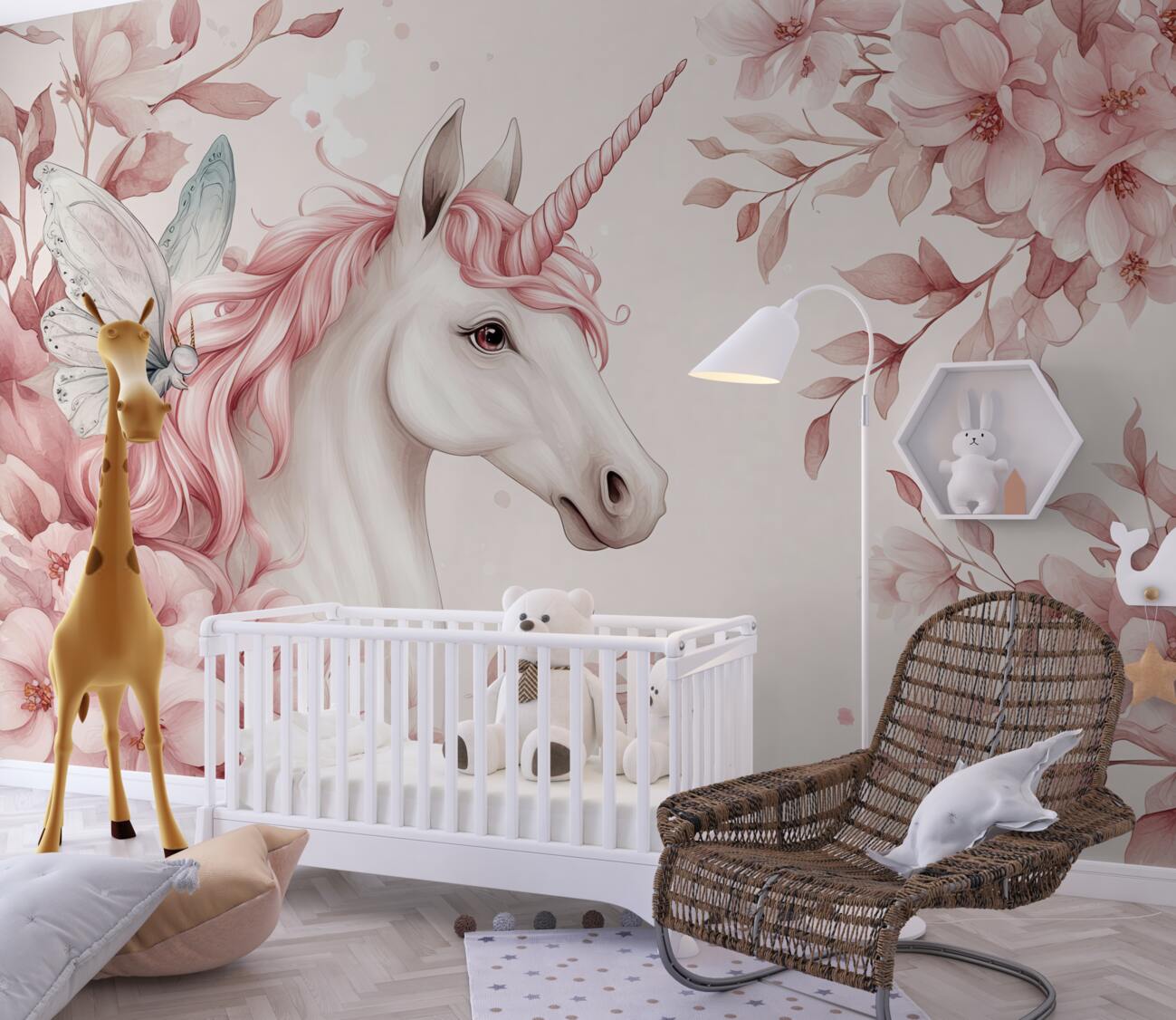 Tapeta Fototapeta Jednorożec z motylem w różowym (artykuł a100113 ) z kategorii Fototapety dla Dzieci