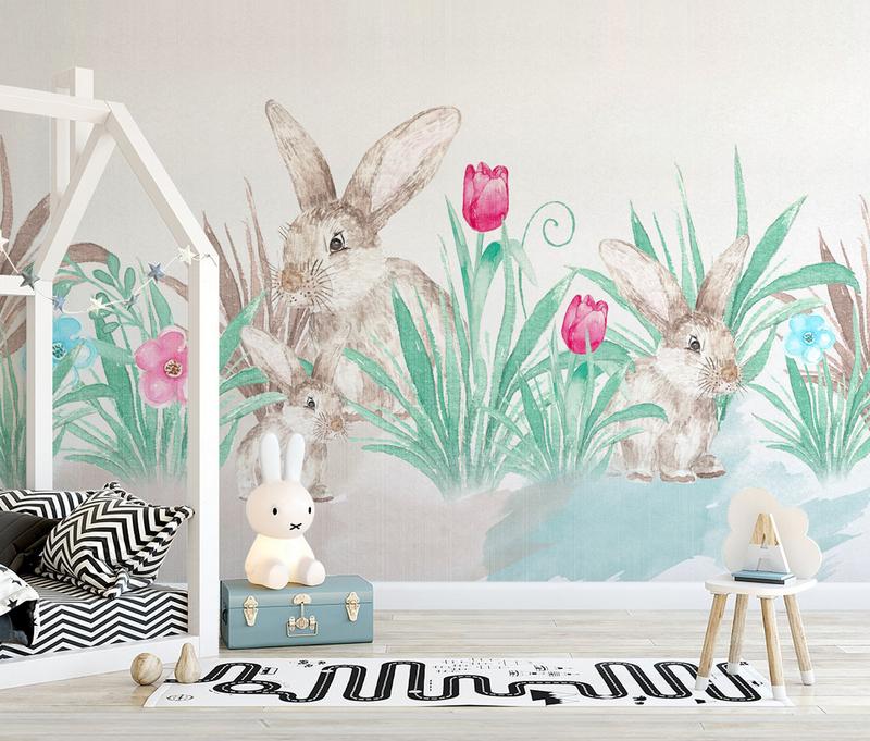 Tapeta Fototapeta kaniki i tulipany różowo zielone (artykuł a735 ) z kategorii Fototapety dla Dzieci