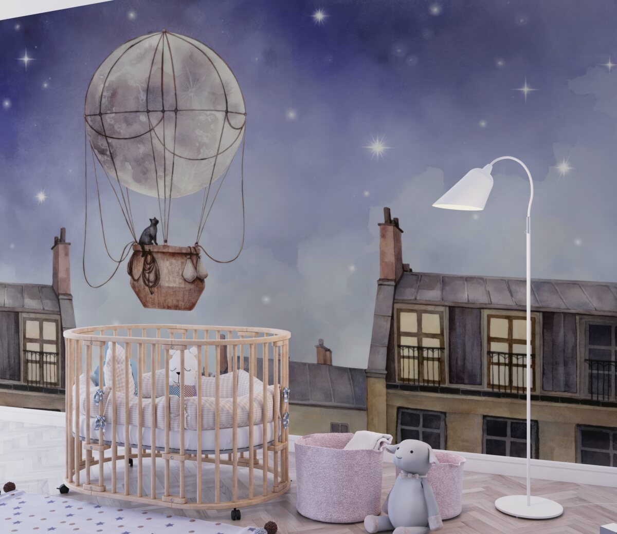 Tapeta Fototapeta Kot leci balonem nad dachami (artykuł a97899 ) z kategorii Fototapety dla Dzieci