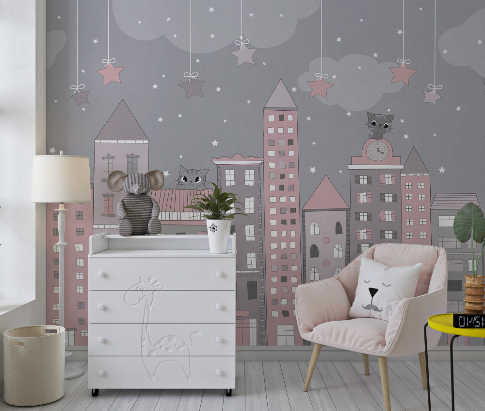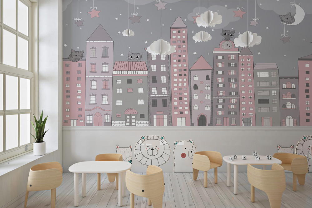 Tapeta Fototapeta koty na dachach domów (artykuł a93874 ) z kategorii Fototapety dla Dzieci