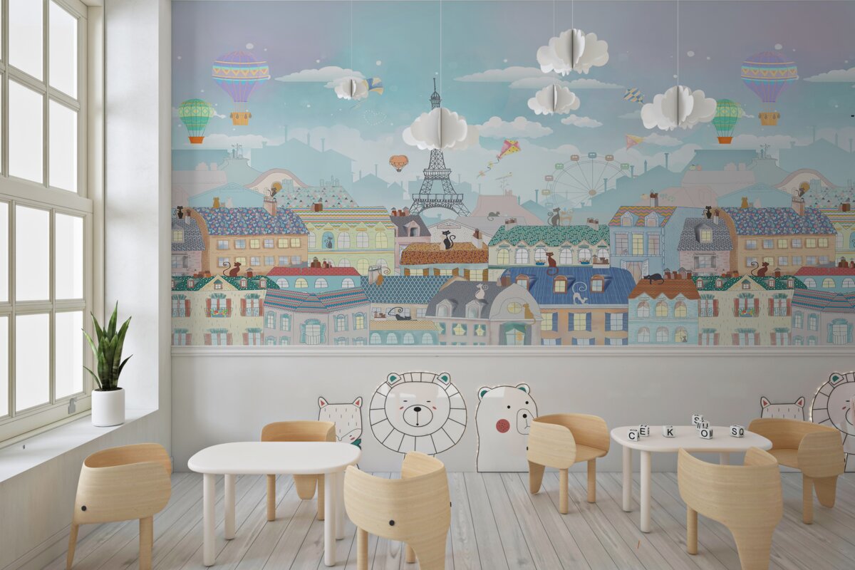 Tapeta Fototapeta Koty na dachach domów w mieście (artykuł a98071 ) z kategorii Fototapety dla Dzieci