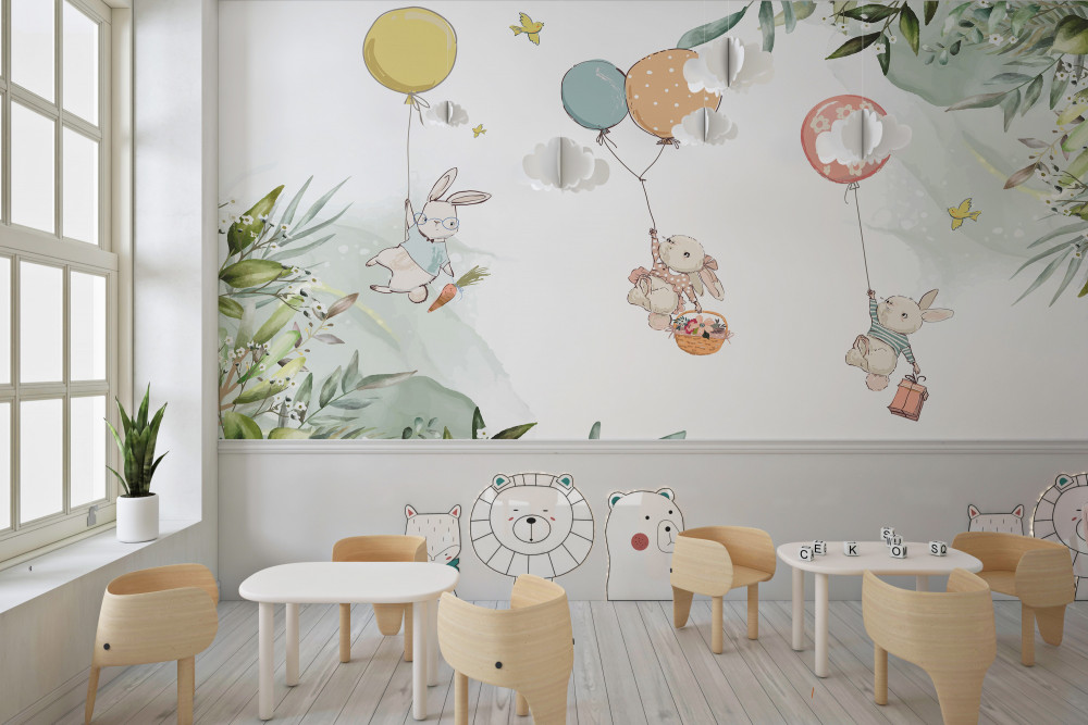 Tapeta Fototapeta króliczki latające na balonach (artykuł a93896 ) z kategorii Fototapety dla Dzieci